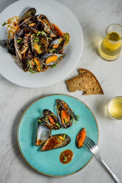 Φρέσκα μύδια με σάλτσα τεριγιάκι, τσίλι και τζίντζερ.