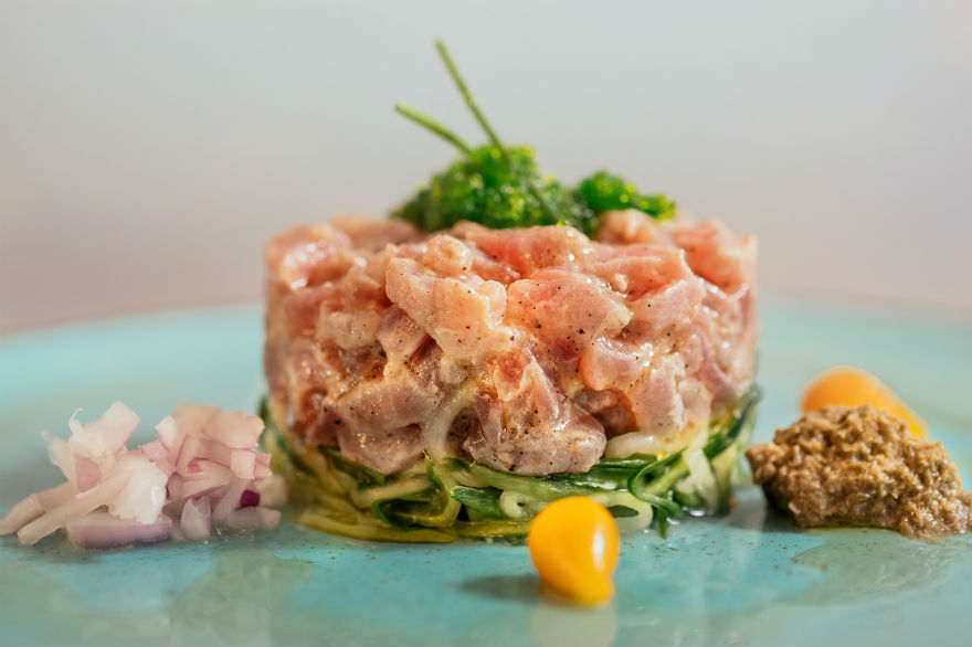 Καρπάτσιο με φιλέτο από φρέσκο λαβράκι που μαρινάρεται στιγμιαία σε χυμό μοσχολέμονου, αρωματικό πιπέρι με φύκια και αβγά χελιδονόψαρου