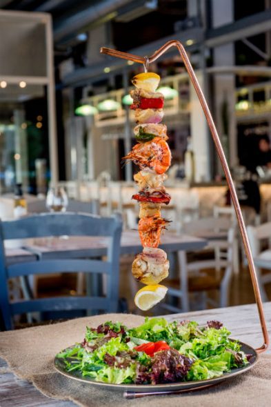 Κοντοσούβλι στη σχάρα με μυλοκόπι, λαβράκι, γαρίδες, θράψαλο, κρεμμύδι, κόκκινη πιπεριά και φινόκιο