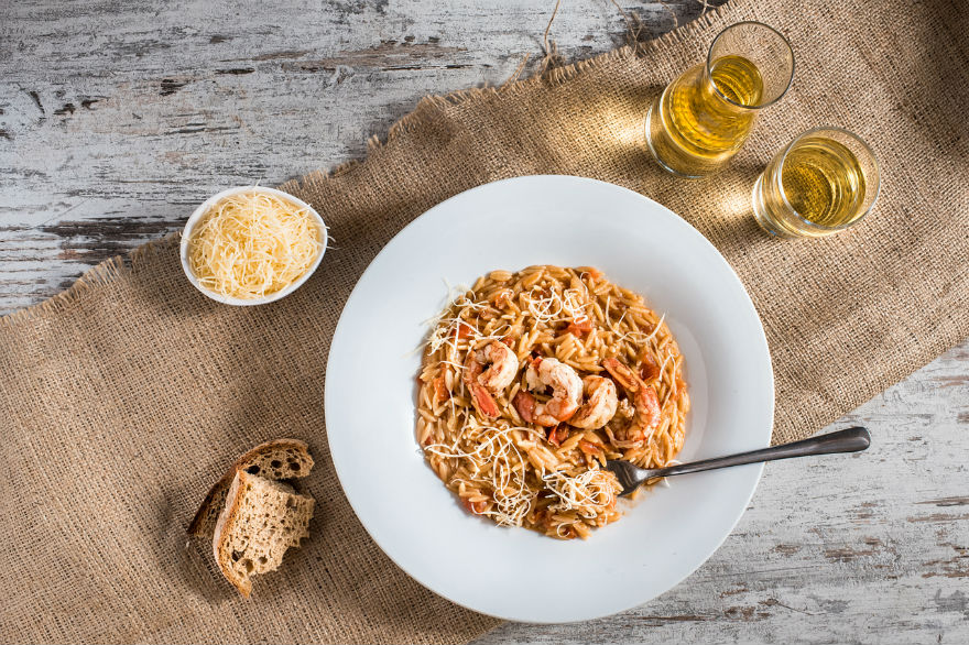 Κριθαράκι γιουβέτσι με γαρίδες, φρέσκια ντομάτα και στακοβούτυρο