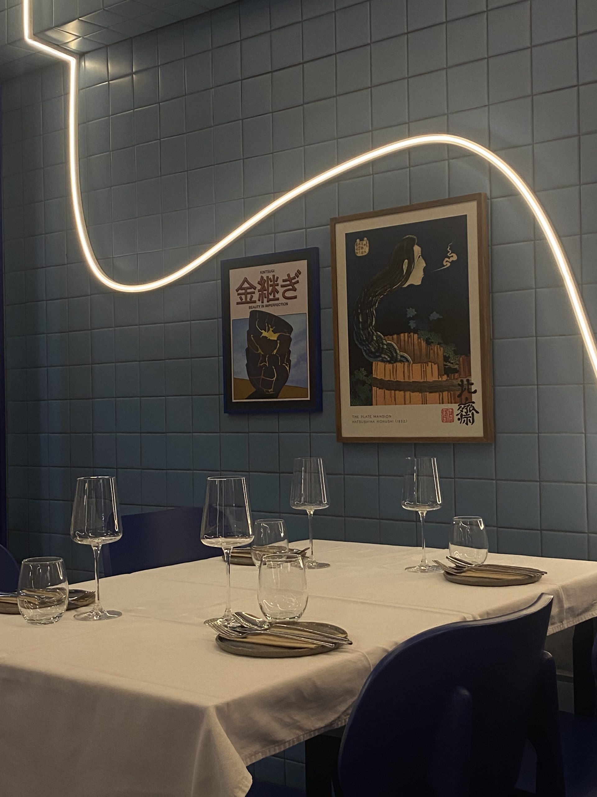 Από την πρώτη ματιά, το Manu σου φτιάχνει τη διάθεση. Είναι καλαίσθητο και προσεγμένο, με μια μίξη που σε κάνει να νιώθεις σαν να βρίσκεσαι ταυτόχρονα στην Ιαπωνία και στην Ελλάδα. Το μπλε χρώμα κυριαρχεί στη διακόσμηση, δημιουργώντας μια αίσθηση ηρεμίας. Η ανοιχτή κουζίνα σε μαγνητίζει, σε κάνει να θέλεις να κοιτάζεις διαρκώς τους σεφ, προσπαθώντας να κλέψεις λίγα από τα μυστικά τους.