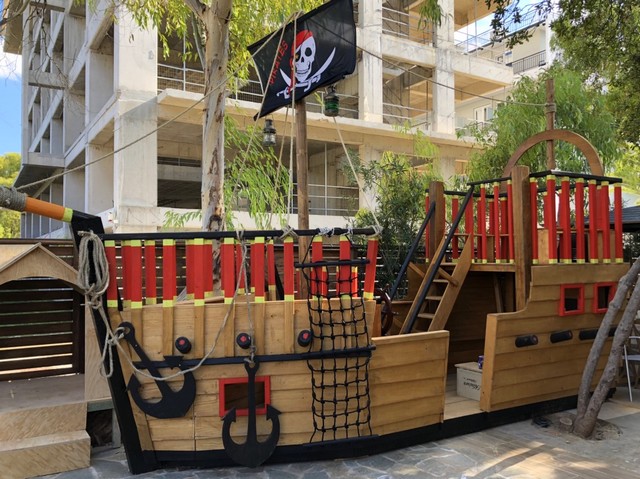 Από την άλλη, η ανοιχτή αυλή, αποτελεί το ιδανικό καλοκαιρινό σκηνικό. Μάλιστα, ένα μεγάλο μέρος της είναι ειδικά αφιερωμένο στους μικρούς φίλους του εστιατορίου, που έχουν την τιμητική τους. Ως οικογενειάρχες αποφάσισαν ότι πρέπει να δημιουργήσουν κάτι εντελώς ξεχωριστό για τα παιδιά. Έτσι έκτισαν ένα μεγάλο χρωματιστό καράβι, μία ‘πειρατική’ γωνία που θα υποδέχεται την οικογένεια μαζί με τα παιδιά, προκειμένου να απασχοληθούν δημιουργικά.