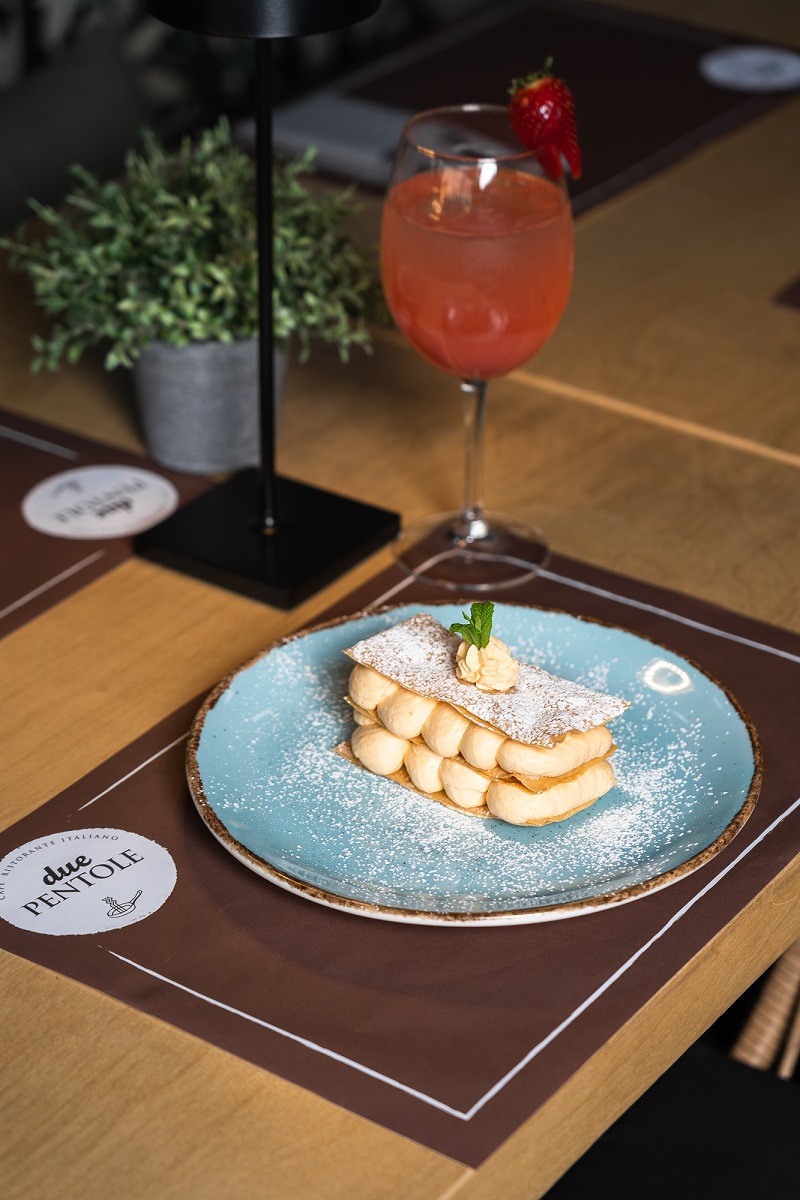 Για το τέλος, κράτησε χώρο και για γλυκό, όπως το απολαυστικό μιλφέιγ του Due Pentole, με μούς πορτοκάλι και τραγανά φύλλα κρούστας.