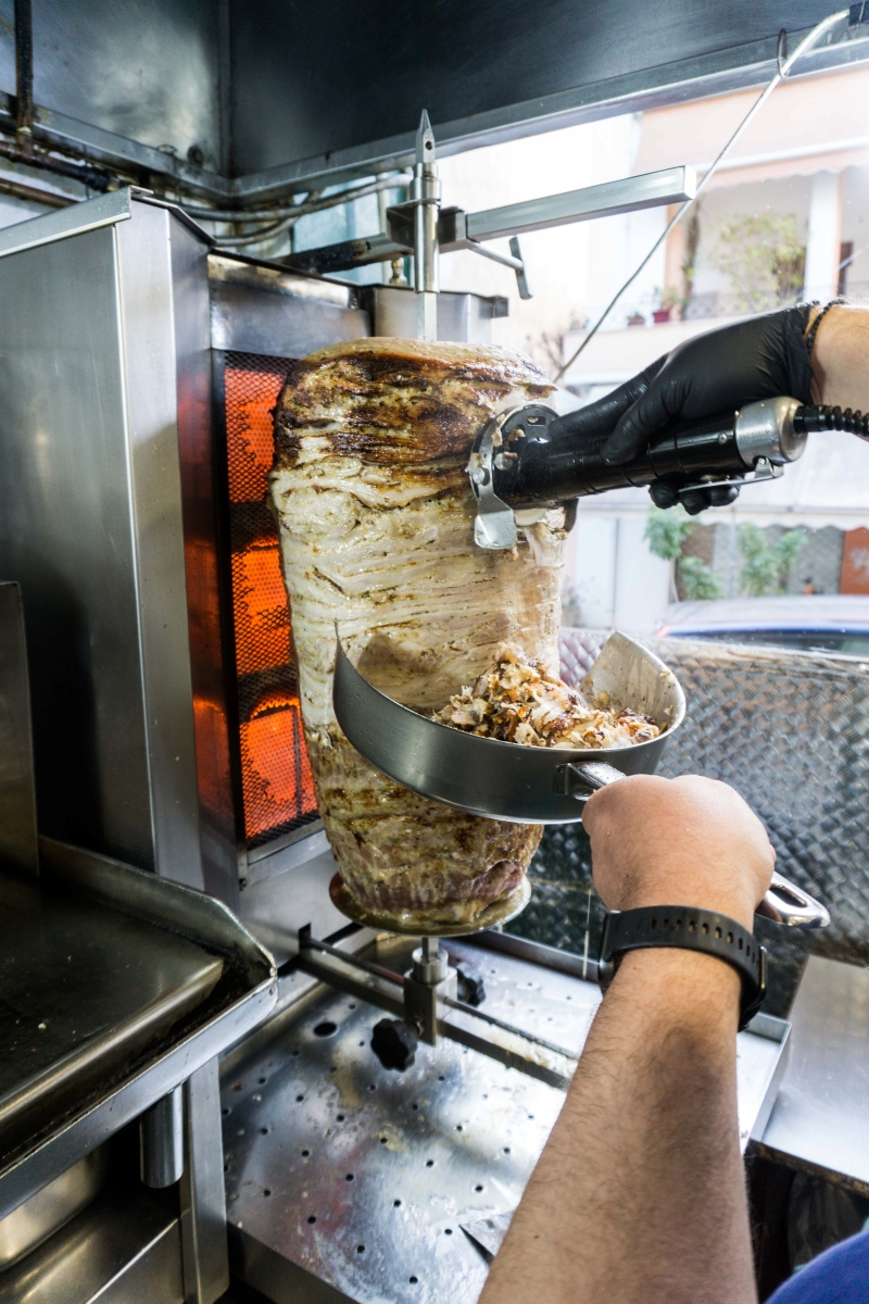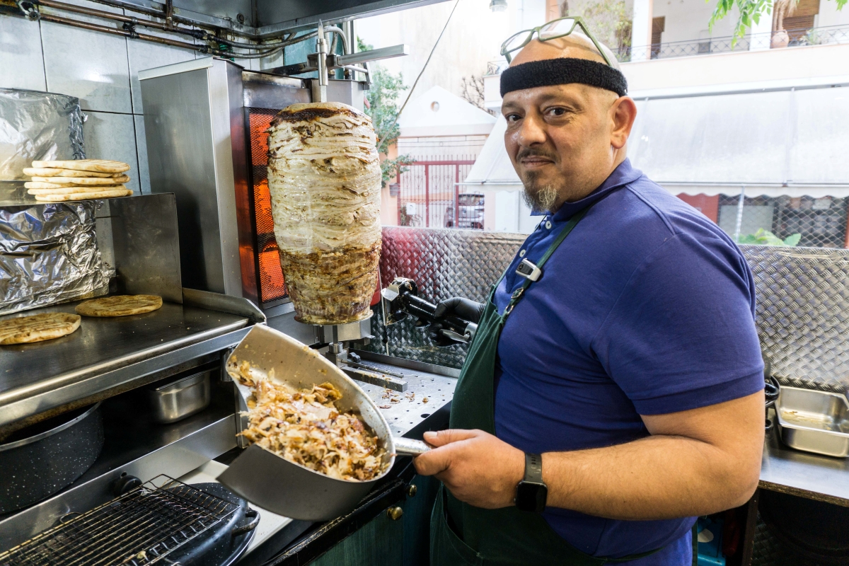 Όσο μιλάμε, ο γύρος γυρίζει αργά και καρτερικά στη θέση του και τα καλαμάκια ψήνονται στα κάρβουνα, με το άρωμα να πλημμυρίζει όλο το μαγαζί. Παρότι είναι νωρίς το απόγευμα, ο κόσμος έχει ήδη αρχίσει να έρχεται και οι πρώτες παραγγελίες να κάνουν την εμφάνισή τους.