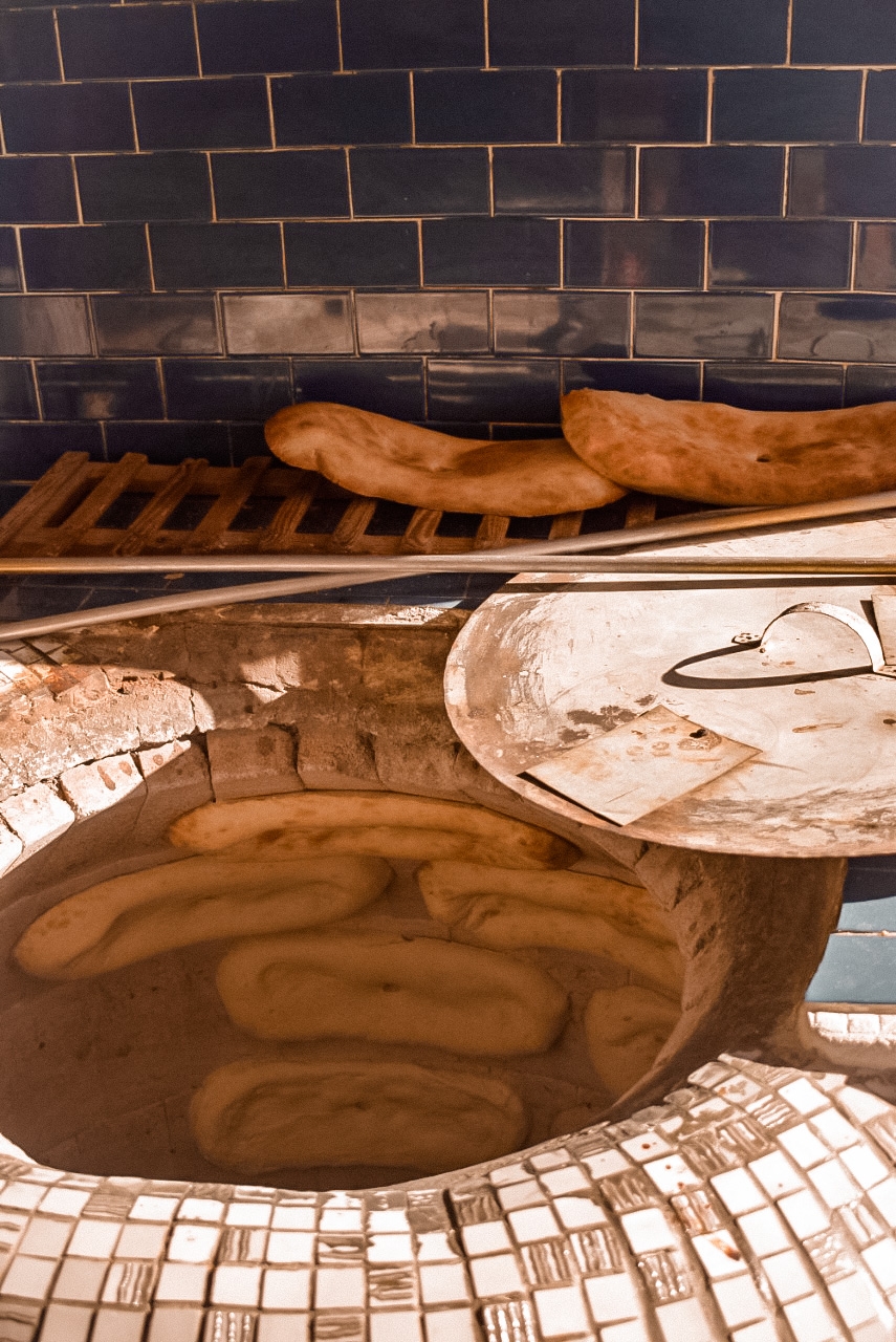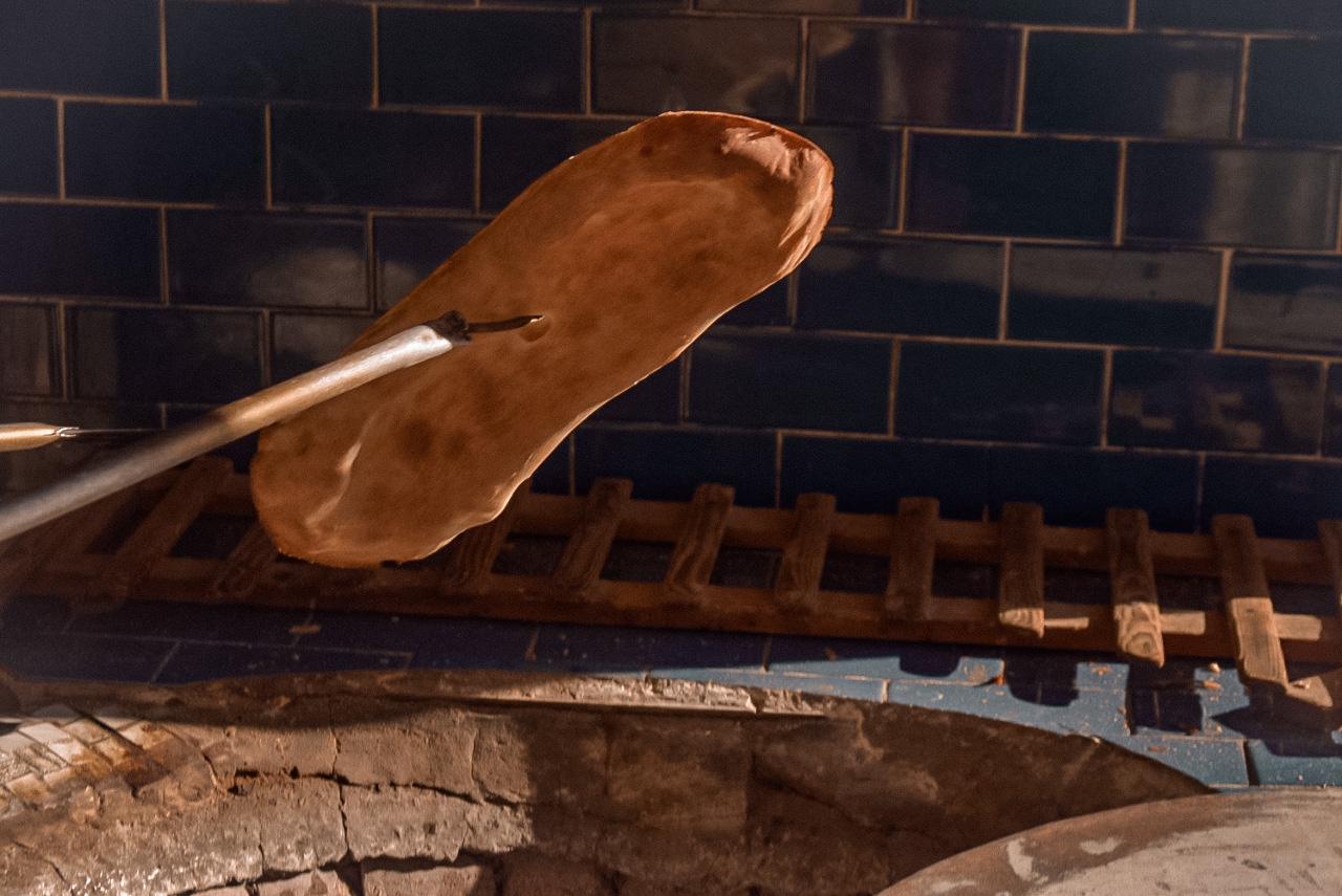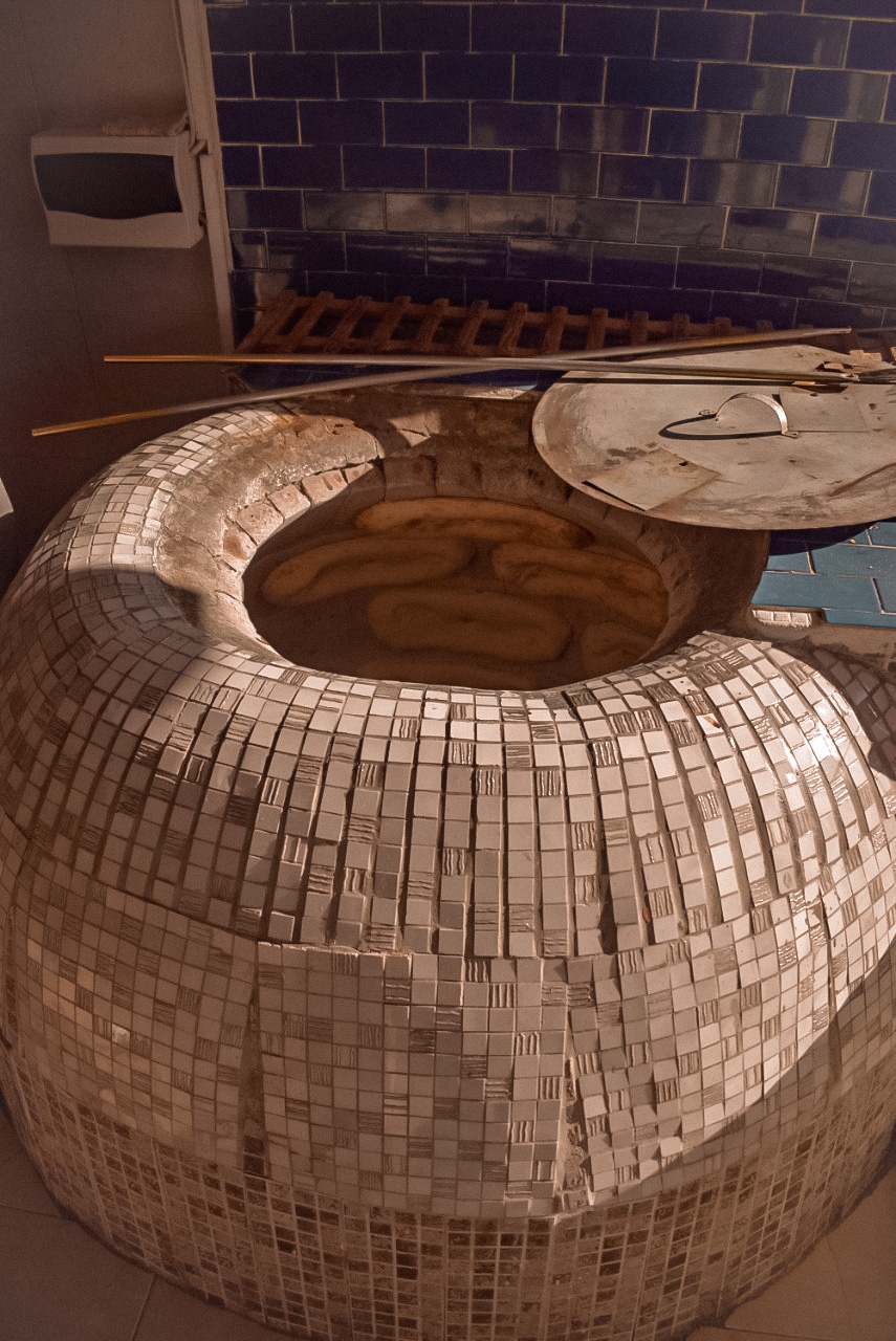 Να σου πω λοιπόν, ότι αυτή η κατασκευή είναι η «καρδιά» του Emigrand, αφού πρόκειται για τον παραδοσιακό θολωτό χτιστό φούρνο που ονομάζεται τονέ και μοιάζει με πηγάδι. «Ανεβάζει μέχρι και 300 βαθμούς θερμοκρασία και στα τοιχώματά του ψήνονται τα γεωργιανά ψωμιά και οι πίτες, που μπαίνουν έπειτα στα ράφια μπροστά», μου εξηγούν με τα σπαστά ελληνικά που μιλούν. Και πράγματι, την ώρα που ο φούρνος μένει ανοιχτός για να τοποθετηθούν τα ζυμάρια, νιώθεις μια καυτή λάβα να βγαίνει από το εσωτερικό του.