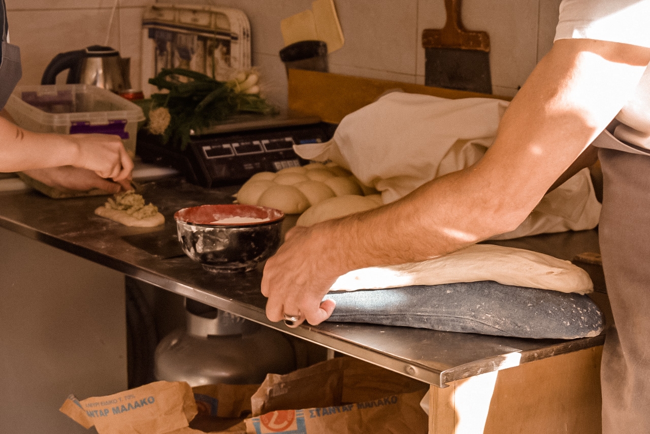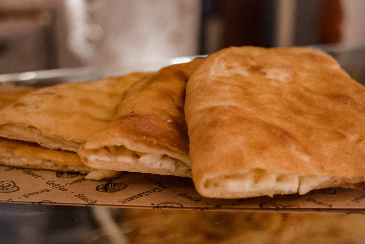 Εκτός από το λαβάς, στο Emigrand ψήνονται και πίτες με διάφορες γεμίσεις, όπως κοτόπουλο, σπανάκι, αυγό, κιμά, πατάτα. Αλλά μια ακόμη επιλογή την οποία δοκίμασα, καθώς έβλεπα ότι ο περισσότερος κόσμος τη ζητούσε μαζί με το ψωμί του, ήταν η τυρόπιτα με το γεωργιανό τυρί imeruli, που ονομάζεται χατσαπούρι. «Το imeruli μοιάζει με το κασέρι, είναι λίγο πιο αλμυρό και μαστιχωτό. Μία από τις πίτες που διαλέγουν οι περισσότεροι, μετά το ψωμί», προσθέτουν.