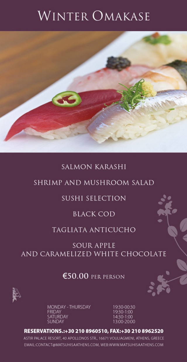 Το μενού κοστίζει 50 ευρώ ανά άτομο. Έτοιμοι να πούμε Matsuhisa γεια στα χέρια σου!