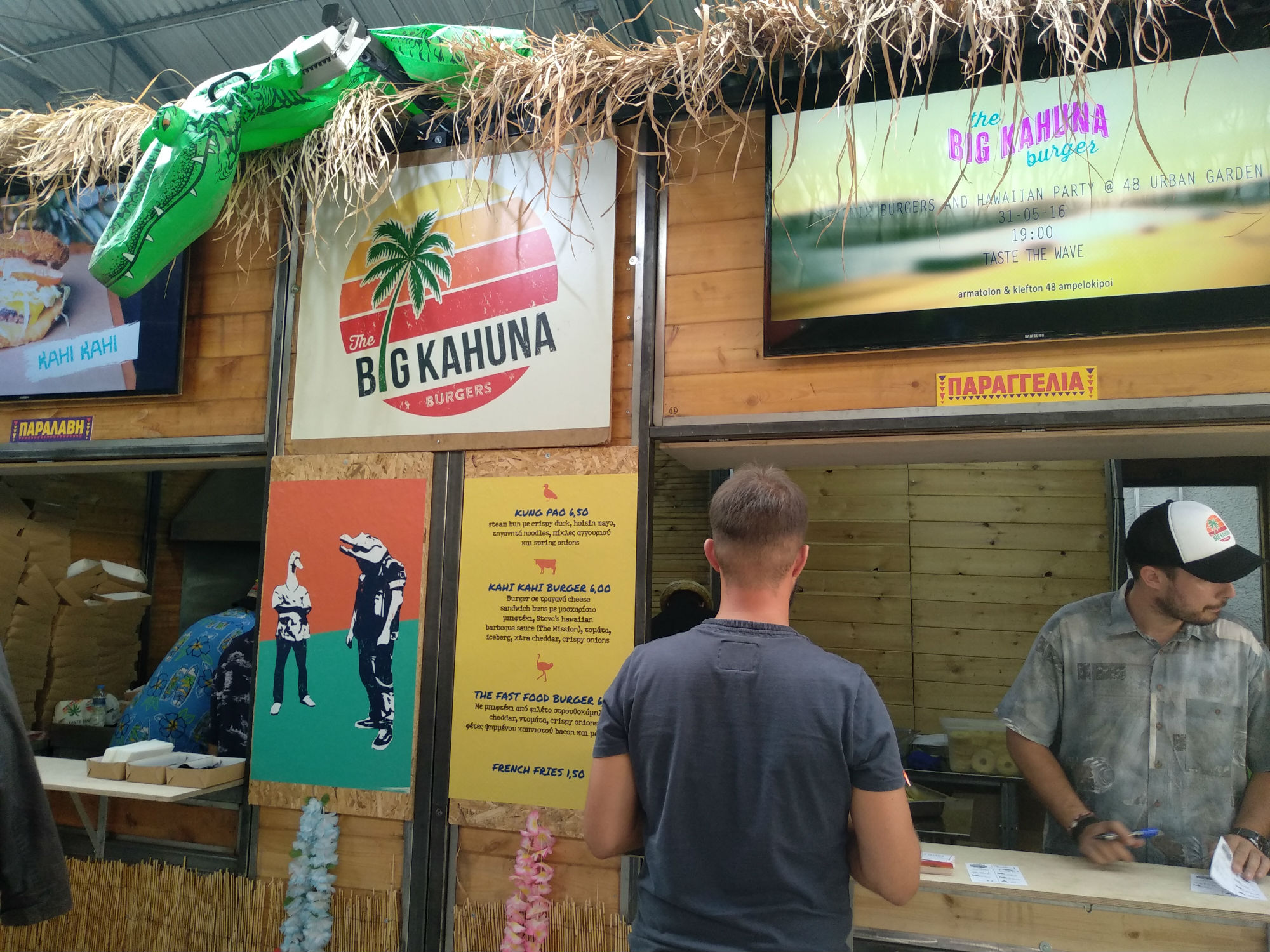 Είναι θεοπάλαβοι αυτοί οι Kahuna! Μιλάω φυσικά για τον σεφ Στέφανο Στεφανίδη και τον επιχειρηματία Δημήτρη Μπαλλιάν, γνωστούς και ως The Kahuna Broz (ελληνιστί Αφοί Καχούνογλου) με κύριο στόχο να φτιάξουν τα πιο ανορθόδοξα exotic burgers (με κοροκόδειλο, αστακό, πάπια) που γεύτηκε ποτέ αυτή η πόλη (εξού και η κεντρική φωτό είναι μια δική τους δημιουργία από το fb τους) και μάλλον τα καταφέρνουν καλά, αφού η ουρίτσα μπροστά στο περίπτερό τους ήταν ουκ ολίγη.