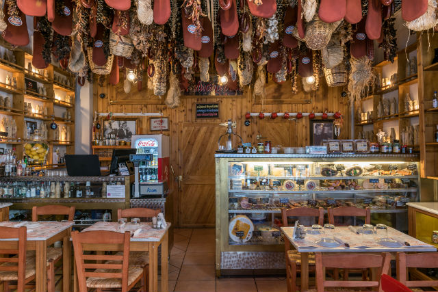 Όπως σας περιέγραψα, λοιπόν, όταν μπήκα στο ΠΑΝΤΟΠΩΛΕΙΟ “Κυρ Αρίστος” μπήκα κατευθείαν στη μηχανή του χρόνου για ένα ταξίδι στην παλιά Αθήνα και τη σύγχρονη Ελλάδα. Σκόρδα, σαλάμια και παστουρμάδες- όλα διακοσμητικά- κρέμονταν από το ταβάνι, τα ράφια είναι γεμάτα από ιδιαίτερα ελληνικά προϊόντα από μικρούς και μεγαλύτερους παραγωγούς και τη βιτρίνα του ψυγείου κοσμούν κάποια από τα πιο σπάνια και νόστιμα τυριά και αλλαντικά που συνάντησαν οι δυο τους κατά την έρευνά τους ανά την Ελλάδα. Λίγο πιο μέσα μία πόρτα … κρεοπωλείου οδηγεί στην κουζίνα.