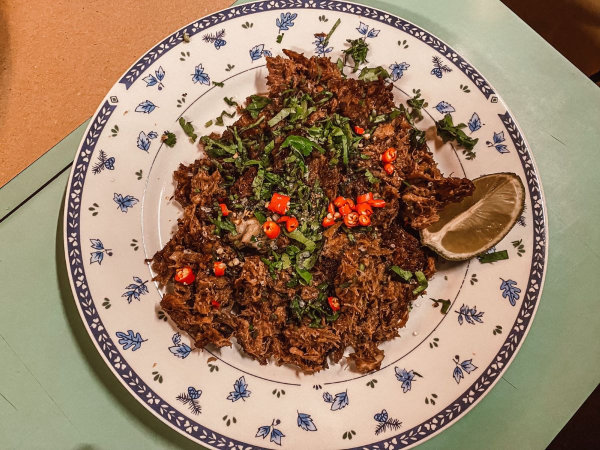 Στα του μενού τώρα, θα σου μιλήσω για το πιάτο που λάτρεψα και από τότε που το δοκίμασα με έχει «στοιχειώσει» -την προβατίνα ραγού, με chilli, κόλιανδρο, lime και λάδι δυόσμου. Το κρέας, που ήταν πολύ νόστιμο και μαλακό, αλλά και ελαφρώς ξεροψημένο στις άκρες, απογειωνόταν με το τσίλι που έδινε μια καυτερή γεύση στο αποτέλεσμα, ενώ το lime έφερνε τη σωστή ισορροπία. Παρόλο που το πιάτο δεν έχει κάποιο συνοδευτικό, να ξέρεις, ταιριάζει άψογα με τις όνειρο-χοντροκομμένες και ολοτράγανες πατάτες, τις οποίες επίσης οφείλεις να δοκιμάσεις.