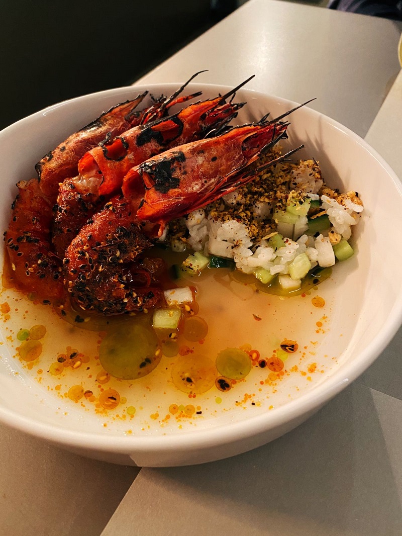 Ένα πιάτο που δεν θα το δεις στα social media του Proveleggios μιας και είναι από τις νέες προσθήκες στον κατάλογο. Ένα πιάτο όμως που επιβάλλεται να πάρεις αν επισκεφτείς το εστιατόριο του Σωτήρη Κοντιζά στο προσεχές μέλλον. Είναι ακριβώς αυτό που λέει ο κατάλογος: τρεις υπέροχες κατακόκκινες γαρίδες, σερβιρισμένες μαζί με ένα γλυκόξινο ζωμό και μερικά συνοδευτικά σε κύβους. Το ιδιαίτερο όμως είναι ότι πριν φτάσει στο τραπέζι σου αυτό το πιάτο θα το καταλάβεις. Στο πάσο, ένα δυνατό φλόγιστρο θα τις καψαλίσει και θα τους δώσει μια υπέροχη καπνιστή επίγευση. Παίρνεις μια στο πιάτο σου, βγάζεις εύκολα το κεφάλι, ρίχνεις από πάνω λίγο από τον ζωμό, κόβεις και δοκιμάζεις. Ψημένη ελάχιστα, όσο πρέπει, μια αίσθηση σαν να είναι σεβίτσε γαρίδας αλλά με μία υπέροχη καπνιστή επίγευση. Μερικές φορές είναι πολύ απλό να φτιάξεις ένα πιάτο που δημιουργεί αναμνήσεις και αυτές οι γαρίδες στο φλόγιστρο μόλις τις δοκιμάσεις θα τις θυμάσαι για πάντα.