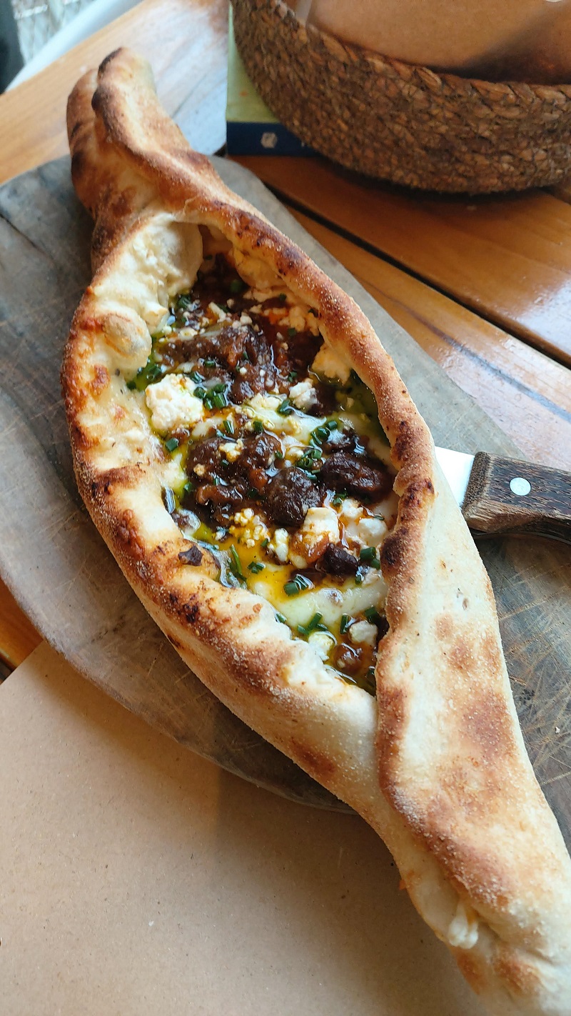 Εμείς, λόγω ώρας μπορούσαμε να παίξουμε και με τα δύο και ενώ μπορώ να ομολογήσω πως ό,τι δοκιμάσαμε μας άρεσε, αυτό που πραγματικά μας ενθουσίασε ήταν το πεϊνιρλί χουνκιάρ. Βουτυράτη, αέρινη ζύμη, που μέσα της είχε μπόλικο λιωμένο τυρί, κομμάτια ψητής μελιτζάνας, κομματάκια μοσχαρίσιου κρέατος και φέτας. Για τι να πρωτοπώ; Για τη νόστιμη ζύμη που δεν ήθελες να αφήσεις ψίχουλο, ούτε καν από τις άκρες της «βαρκούλας», το τρυφερό μοσχαράκι ή την απίστευτη επίγευση καπνιστής μελιτζάνας σε κάθε μπουκιά; Θα αρκεστώ να πω ότι φτάσαμε πολύ κοντά στο «να τρώει η μάνα και του παιδιού να μην δίνει», αλλά εντάξει, πρόλαβε και η μικρή αρκετό.