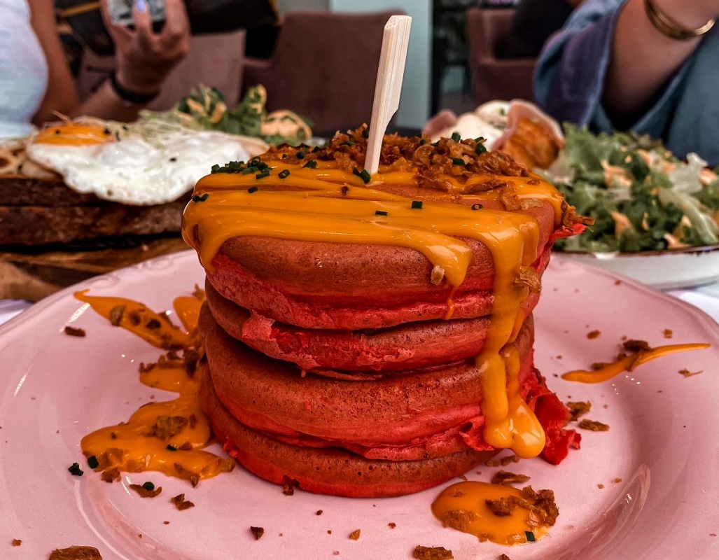 Το μενού είναι γεμάτο δελεαστικές προτάσεις, που σε κάνουν να αναρωτιέσαι: αλμυρό ή γλυκό; Μετά από (πραγματικά) πολλή ώρα σκέψης, καταλήγω στα αλμυρά pancakes με μπέικον, τυρί cheddar και crispy onion. Το πιάτο κανονικά συνοδεύεται με δύο αβγά, αλλά αν, λέω αν έχεις παρακολουθήσει αυτή τη στήλη, θα ξέρεις ότι δεν αγαπώ ιδιαίτερα το αβγό, οπότε το αφαίρεσα. Το πιάτο έρχεται μπροστά μου και αντικρίζω ένα μικρό βουνό με τέσσερα λαχταριστά pancakes, αφράτα και πολύ γευστικά. Το τσένταρ στη σωστή ποσότητα, ώστε ούτε να σε μπουχτίζει, αλλά ούτε και να σε κάνει να θες περισσότερο και το crispy κρεμμύδι ήταν μια ενδιαφέρουσα προσθήκη στο πιάτο. Αν επισκεφτείς το Mademoiselle για brunch θα σου πρότεινα να το δοκιμάσεις.