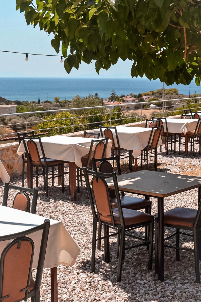 Από το 2004, η ταβέρνα «Αντιγόνη» μεταφέρθηκε στα πιο ψηλά του Θυμαρίου, όπου στρώνει δεκάδες τραπέζια κάτω από τις γραφικές μουριές πάνω στο χαλικάκι. Και η θέα; Υπέροχη. Πιάνοντας θέση έξω έξω βλέπεις μέχρι τη θάλασσα και ένα εντυπωσιακό ηλιοβασίλεμα -αν τύχει και βρίσκεσαι εκεί προς το σούρουπο.