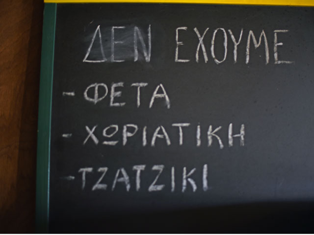 Σε περίοπτη θέση υπάρχει και μαυροπίνακας που γράφει ότι δεν προσφέρονται τα εν λόγω εδέσματα. “Την έβαλα στο δεύτερο μήνα της λειτουργίας μας, γιατί σε όποιο τραπέζι πήγαινα για παραγγελία μου έλεγαν αυτά τα τρία και εξηγούσα κάθε μέρα, εκατό φορές πως δεν έχουμε”. Πλέον δεν τα ζητά κανείς. Η συνέπεια που έδειξε η ιδιοκτησία στην υπεράσπιση της ταυτότητας έχει φτάσει στο σημείο “να φτιάξουμε μπακαλιάρο κοκκινιστό για την 25η Μαρτίου, έτσι για το καλό της ημέρας και τον φάγαμε μόνοι μας. Πήγαινα στα τραπέζια και δεν με πίστευαν (γελάει)”.