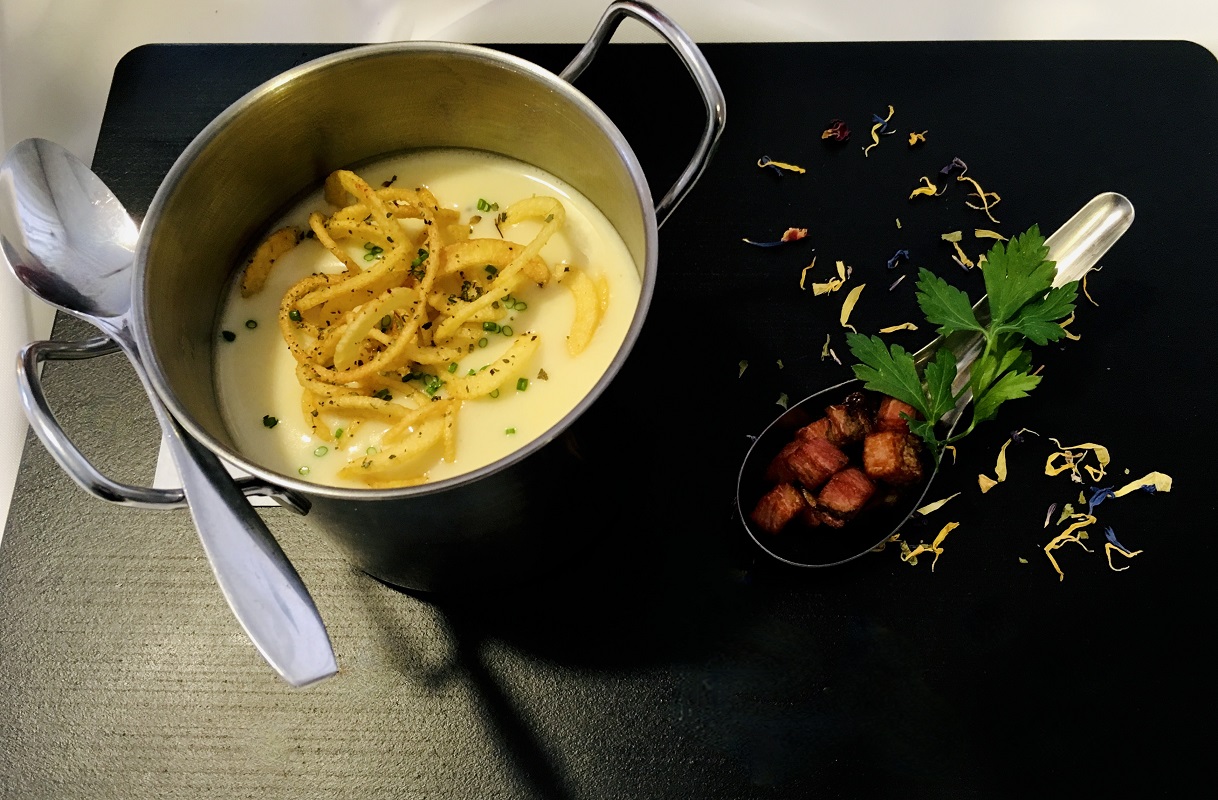 Κρεμώδης σούπα πατάτας με απάκι και σχοινόπρασο