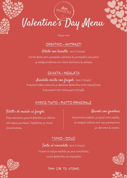 Το μενού του Due Pentole για τη βραδιά του Αγίου Βαλεντίνου