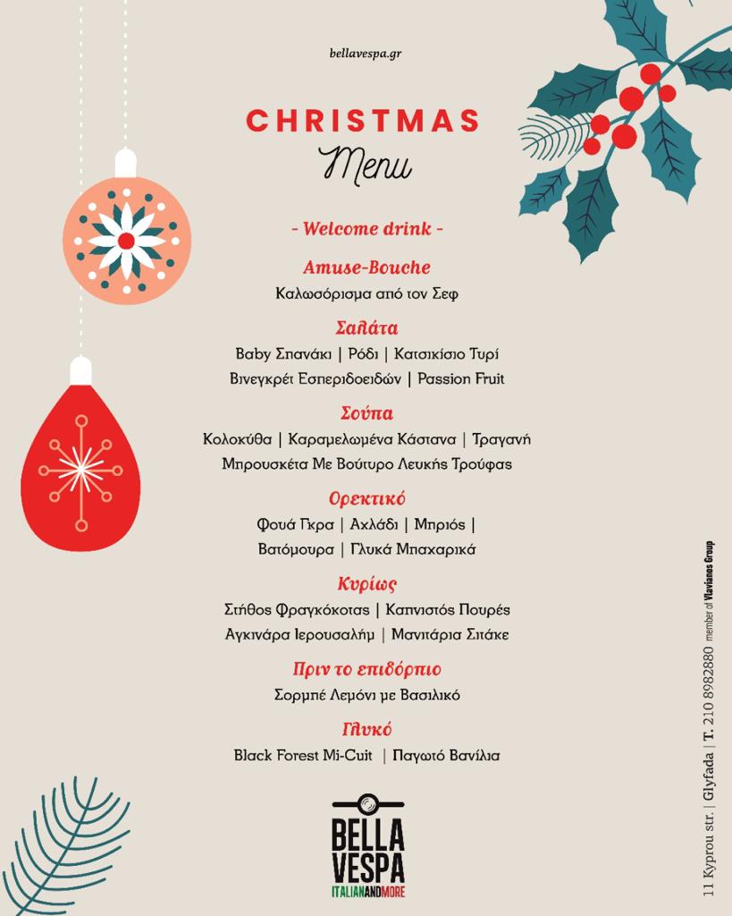 Τo Bella Vespa στη Γλυφάδα βάζει τα καλά του και μας υποδέχεται για ένα ολοκληρωμένο μενού για την Παραμονή των Χριστουγέννων που ανυπομονούμε να απολαύσουμε.