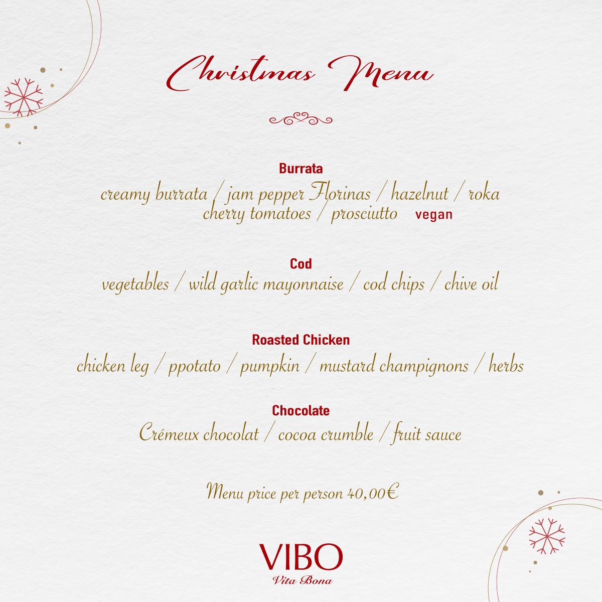 Για την Παραμονή των Χριστουγέννων, το Vibo έχει ετοιμάσει ένα γευστικό ταξίδι που ξεκινά με μια burrata συνοδευόμενη από μαρμελάδα πιπεριάς Φλωρίνης, φουντούκια, ρόκα, ντοματίνια και προσούτο. Στη συνέχεια, ο μπακαλιάρος με λαχανικά, μαγιονέζα άγριου σκόρδου, τσιπς μπακαλιάρου και λάδι σχοινόπρασου συνδυάζει παράδοση και δημιουργικότητα. Το κυρίως πιάτο, ένα ψητό μπούτι κοτόπουλου με baby πατάτες, κολοκύθι και σαμπαγιόν μουστάρδας, ολοκληρώνει το δείπνο με γεύσεις που ζεσταίνουν την καρδιά. Το γεύμα κλείνει με μια σοκολατένια δημιουργία – Crémeux σοκολάτας με crumble κακάο και σάλτσα καρπού κακάο, ιδανική για να ολοκληρώσει την εμπειρία.