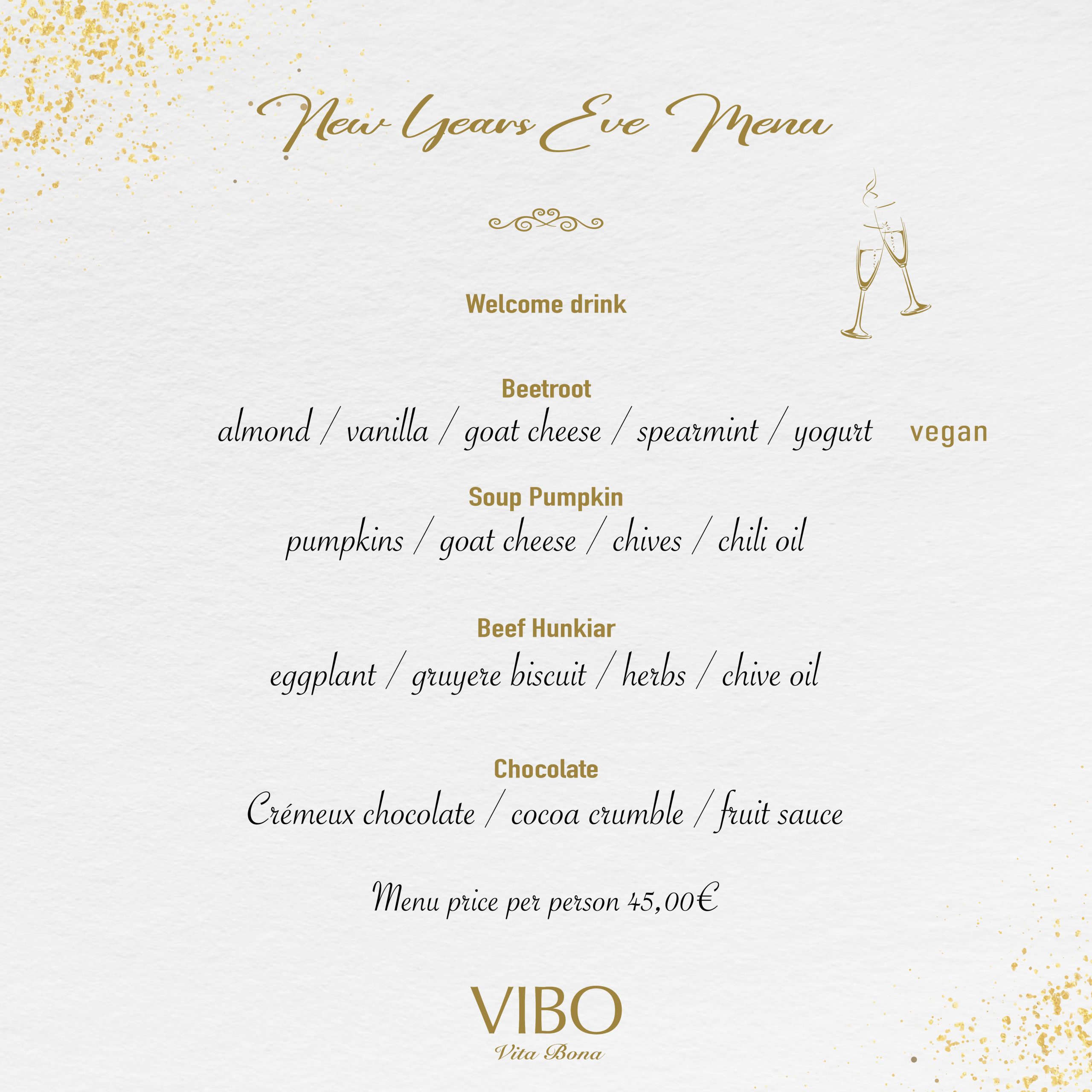 Η νέα χρονιά στο Vibo ξεκινά με ένα εντυπωσιακό δείπνο, για το πρωτοχρονιάτικο Ρεβεγιόν, που συνδυάζει κομψότητα και ωραίες γεύσεις. Το welcome drink θέτει τη διάθεση για το υπόλοιπο βράδυ, ενώ η αρχή γίνεται με ένα πιάτο από παντζάρι, αμύγδαλο, βανίλια, κατσικίσιο τυρί, μέντα και γιαούρτι. Μια βελούδινη σούπα κολοκύθας με κατσικίσιο τυρί, σχοινόπρασο και λάδι τσίλι φέρνει στη συνέχεια ζεστασιά στο τραπέζι. Για κυρίως, το μοσχάρι χουνκιάρ με μελιτζάνα, μπισκότο γραβιέρας, μυρωδικά και λάδι σχοινόπρασου είναι ένα πιάτο που συνδυάζει παράδοση και καινοτομία. Το δείπνο ολοκληρώνεται με Crémeux σοκολάτας, crumble κακάο και σάλτσα καρπού κακάο, για να καλωσορίσετε το 2025 με την πιο γλυκιά αίσθηση.