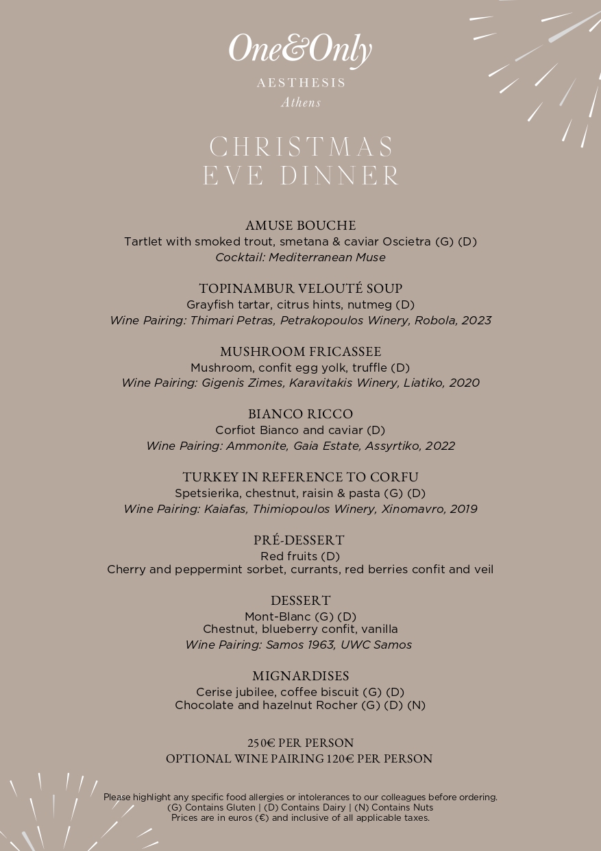 Στο χριστουγεννιάτικο μενού, η γαλοπούλα μαγειρεύεται με μια συνταγή εμπνευσμένη και πάλι από την Κέρκυρα -την ιδιαίτερη πατρίδα του σεφ – με σπετσερικό, κάστανο, σταφίδες και ζυμαρικά. Κάπως έτσι ολοκληρώνεται το κυρίως μέρος του δείπνου και ακολουθεί μια σειρά από πλούσια γλυκά, σορμπέ κεράσι και δυόσμου με κερκυραϊκές σταφίδες, confit κόκκινων φρούτων και veil, στη συνέχεια γαλλική mont-blanc με κάστανο, blueberries confit και βανίλια και τέλος τα γλυκά mignardises (cerise jubille με μπισκότο καφέ και rocher με σοκολάτα και αμύγδαλο).