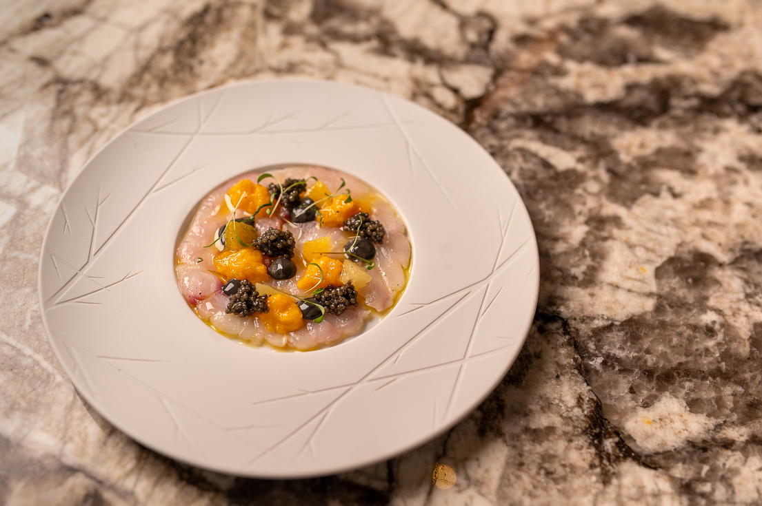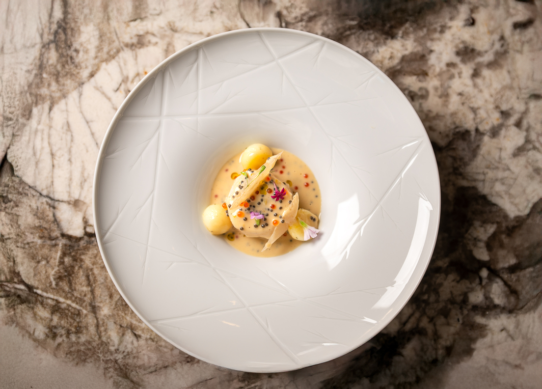 Το δείπνο, με τη συνοδεία live band, ξεκινά με ένα ιδιαίτερο amuse bouche -Tartlet με καπνιστή πέστροφα, smetana και χαβιάρι Oscietra – που δίνει μια μικρή πρόγευση για όσα θα ακολουθήσουν: Πρώτο πιάτο μια βελουτέ αγκινάρας Ιερουσαλήμ με ταρτάρ καραβίδας, νότες λεμονιού και κάρδαμο και, για τη συνέχεια, φρικασέ μανιταριών με confit κρόκο αβγού και τρούφα, πριν στο τραπέζι φτάσει το Bianco Ricco, ένα πιάτο με βασισμένο στο παραδοσιακό κερκυραϊκό Μπιάνκο με ψάρι σε λευκή σάλτσα από λεμόνι και σκόρδο, στο οποίο ο σεφ έχει προσθέσει χαβιάρι για μια νότα πολυτέλειας και έντασης.