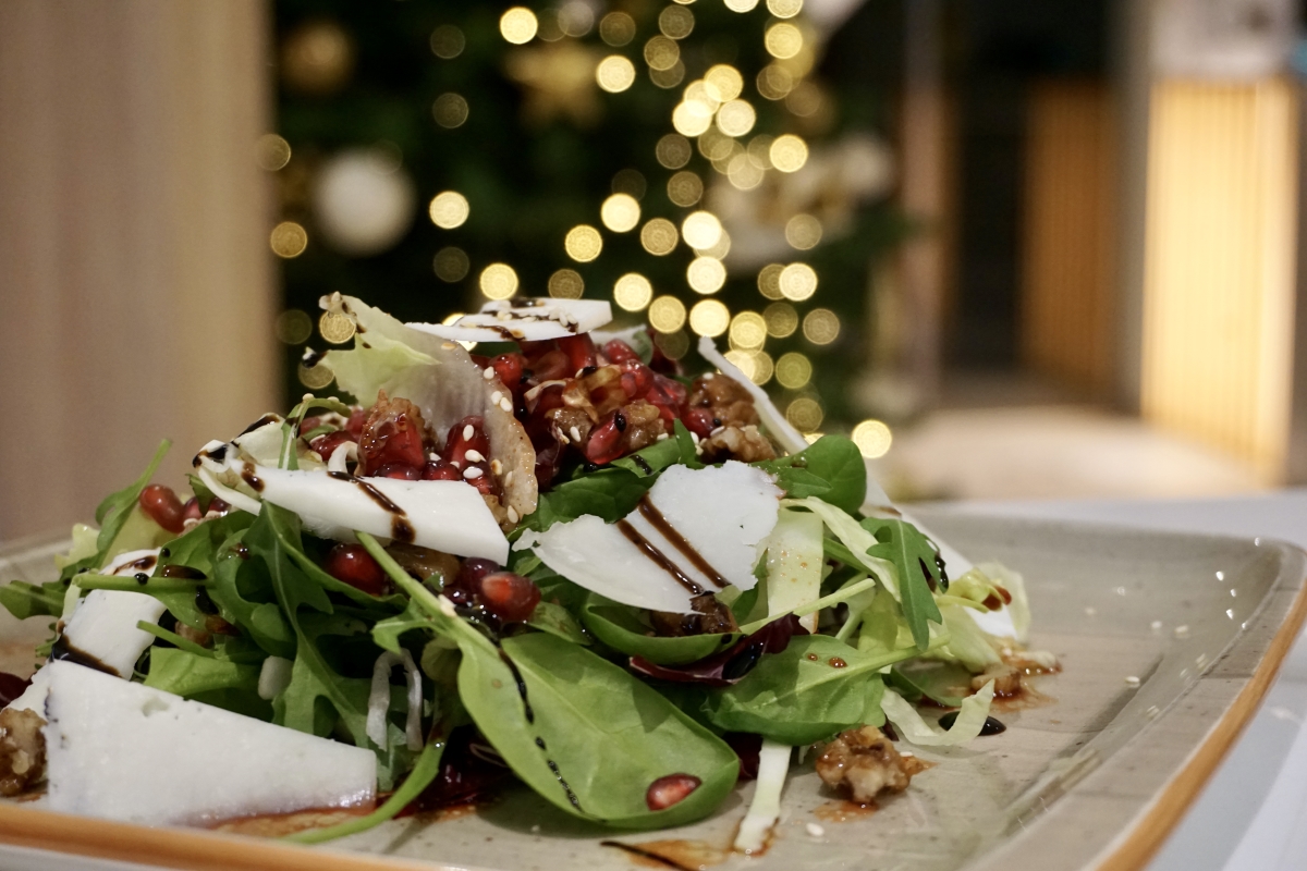 Εορταστική σαλάτα με φυλλώδη λαχανικά, καραμελωμένα καρύδια, ρόδι και νιφάδες πεκορίνο από τον Κωνσταντίνο Κωβαίο