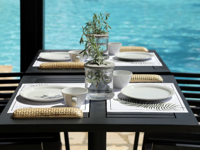 Στο εστιατόριο Μεζέ θα βρείτε φρέσκα ψάρια και μεγάλη ποικιλία από ούζο και τσίπουρο. Το κεντρικό εστιατόριο, Asado, προσφέρει πρωινό μπουφέ, καθώς και a la-carte μενού όλη την διάρκεια της ημέρας, ενώ το βράδυ μπορείτε να απολαύσετε δείπνο στο εστιατόριο Baxe δίπλα από το open air τζάκι όπου στον κατάλογο θα βρείτε εκλεκτά πιάτα με διεθνείς επιρροές και γεύσεις. Από την άλλη, υπάρχει η δυνατότητα για ιδιωτικό δείπνο γευσιγνωσίας στο μοναδικό “Alati Private Restaurant” πάνω στο κύμα ή προβολή μιας ρομαντικής ταινίας.