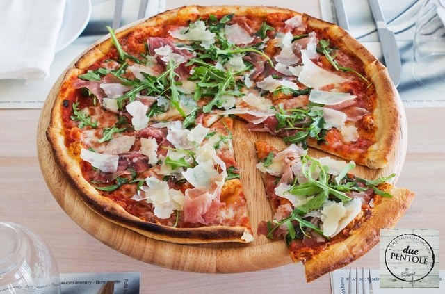 Η αγαπημένη μας πίτσα στο Due Pentole, είναι σίγουρα αυτή με το προσούτο 24 μηνών παρακαλώ, flakes παρμεζάνας, σάλτσα ντομάτας, μοτσαρέλα και δροσιστική ρόκα. Το αποτέλεσμα; Θεϊκό.