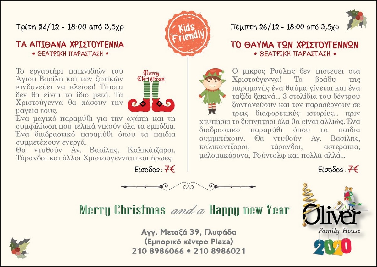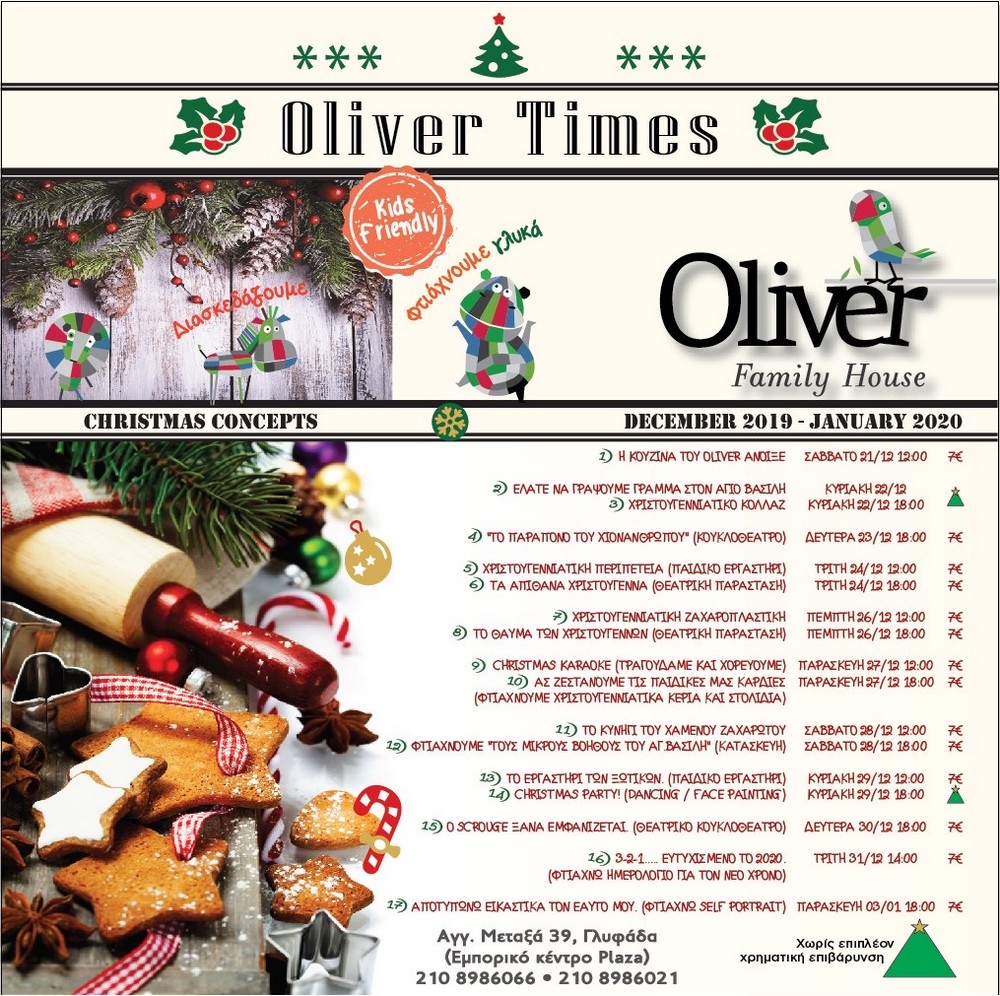 Τα Χριστούγεννα είναι πάντα ιδιαίτερα στο Οliver, γι’αυτό και φέτος ετοιμάζει πολλές εκδηλώσεις για τα παιδιά. Στο εορταστικό πρόγραμμα πρωταγωνιστούν οι δημιουργικές κατασκευές. Χριστουγεννιάτικα κεριά, στολίδια, ημερολόγιο για τη νέα χρονιά και πολλές άλλες κατασκευές από ανακυκλώσιμα υλικά από τα χεράκια των παιδιών. Επίσης διοργανώνονται θεατρικές παραστάσεις με διαδραστικά παραμύθια, κουκλοθέατρο, ζαχαροπλαστική και PARTY με δυνατή μουσική και τραγούδι. (Όλες οι πληροφορίες γύρω απο τις φετινές εκδηλώσεις των Χριστουγέννων βρίσκονται στο site του Oliver family house και στα social media του).
