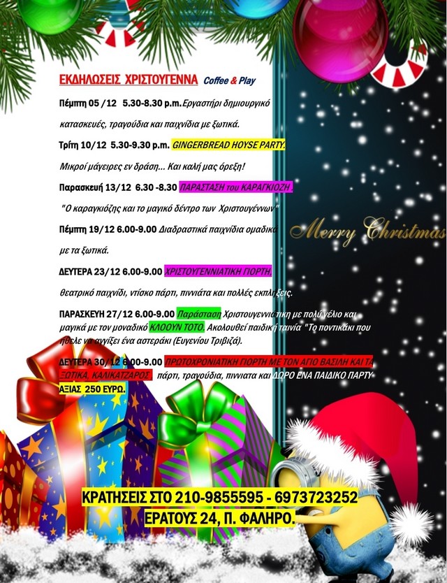 O αγαπημένος παιδότοπος στο Παλαιό Φάληρο ετοιμάζει Χριστουγεννιάτικες εκδηλώσεις που θα λατρέψουν μικροί και μεγάλοι! Την Δευτέρα 23/12 (18.00-21.00) ετοιμαστείτε για θεατρικό παιχνίδι, ντίσκο πάρτι, πιννιάτα και πολλές εκπλήξεις στην πιο ωραία Χριστουγεννιάτικη γιορτή. Την Παρασκευή 27/12 (18.00-21.00), στήνεται μια Xριστουγεννιάτικη παράσταση με άφθονο γέλιο και μαγικά, με τον κλόουν Τότο. Αφού γελάσουν και διασκεδάσουν, θα παρακολουθήσουν την ταινία «Το ποντικάκι που ήθελε να αγγίξει ένα αστεράκι» του Ευγένιου Τριβιζά. Λίγο πριν αποχαιρετήσουμε τη χρονιά, την Δευτέρα 30/12, σας περιμένει μια πρωτοχρονιάτικη γιορτή με τον Άγιο Βασίλη και τα ξωτικά, καλικάτζαρους, σε ένα υπέροχο πάρτυ με τραγούδια, πιννιάτα και δώρο ένα παιδικό πάρτυ αξίας 250 ευρώ. Μην ξεχνάς ότι στο Coffee & Play διοργανώνονται τα πιο ωραία παιδικά θεματικά πάρτι.
