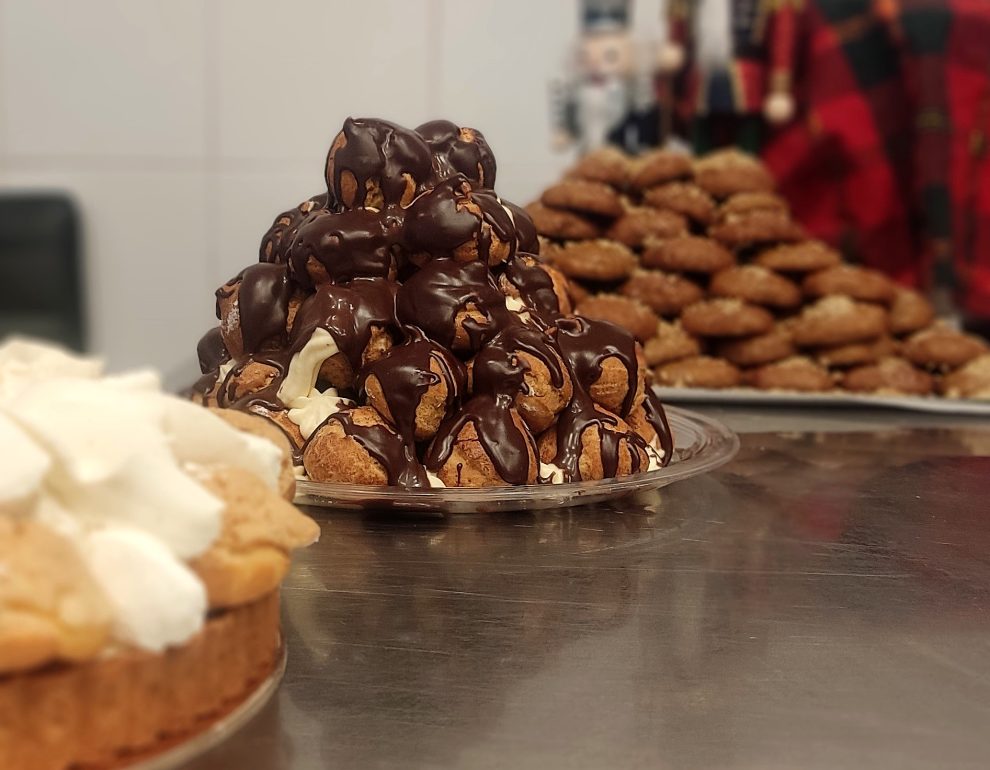 Γαλλικής καταγωγής είναι και ο έτερος χριστουγεννιάτικος πρωταγωνιστής του Prodromos Pies and Pastries: Το croque-en-bouche (ή croquembouche), ένα γλυκό με φρεσκοψημένα γεμιστά σουδάκια, στημένα σε πυραμίδα και περιχυμένα -στην εκδοχή του Πρόδρομου- με σοκολάτα. Στο εργαστήριο αυτές τις μέρες ετοιμάζονται επίσης χριστουγεννιάτικοι κορμοί (όπως ο απόλυτα σοκολατένιος Ferrero και ο πιο ντελικάτος με τη βανίλια και τα φρούτα του δάσους), γιορτινά «διώροφα» cakes (red velvet και carrot cake με frosting τυριού, σταφίδες και καρύδια pecan) αλλά και η παραδοσιακή βασιλόπιτα που ο Πρόδρομος φτιάχνει με μια πολίτικη συνταγή 100 περίπου ετών, την οποία πήρε από τον παππού του.