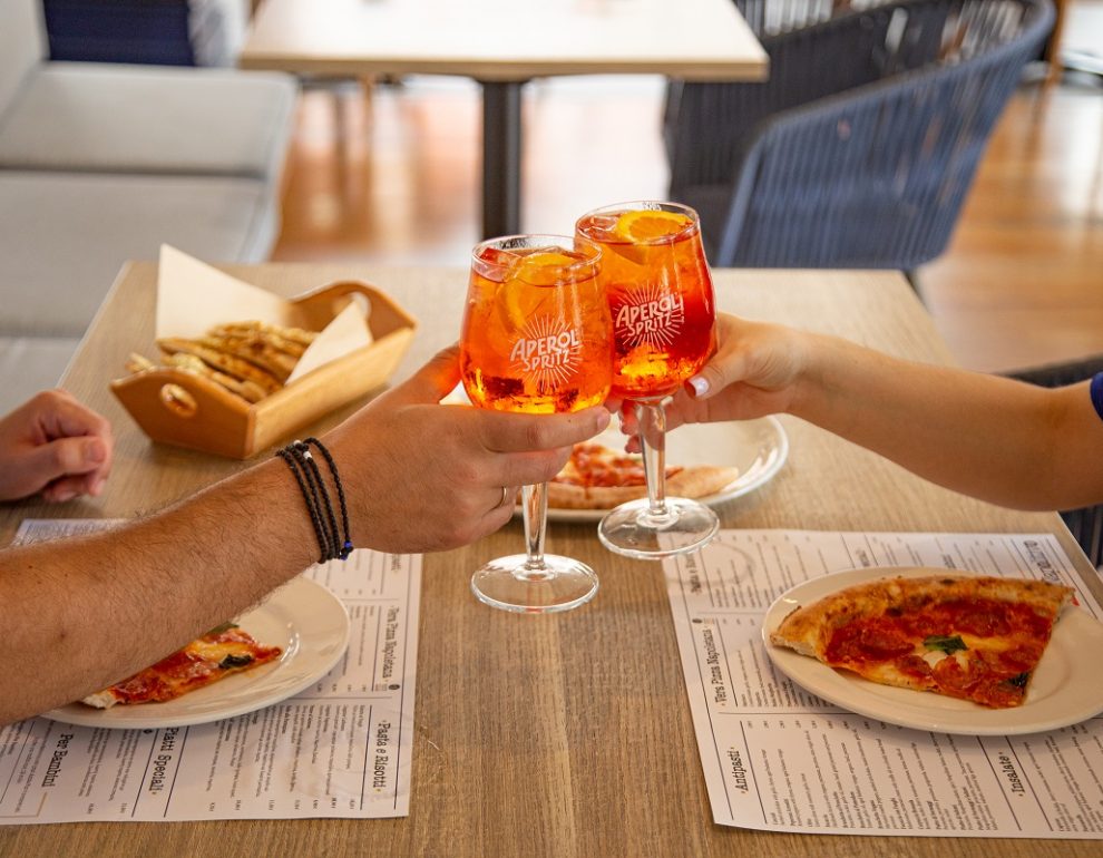 Όσο για το ποτό, προτείνουμε Spritz all’Italiana, με την κάρτα των aperitivo να έχει εμπλουτιστεί με τρεις νέες γεύσεις. Συνδύασε την φρέσκια pasta με το Dolce Vita Spritz με φράουλα ή το Frozen Aperol για ένα πιο δροσιστικό twist και πλάι στην πίτσα βάλε ένα αρωματικό Limoncello Spritz και έχεις τον τέλειο συνδυασμό.