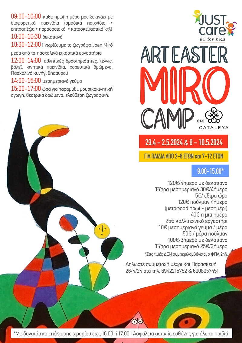 Για το φετινό Πάσχα, η Just Care – All for Kids διοργανώνει ένα μοναδικό easter camp στον κτήμα Cataleya, που βάζει στο επίκεντρο την Τέχνη. Το Art Easter Miro Camp θα λειτουργεί σε δύο φάσεις, από τη Μεγάλη Δευτέρα 29 Απριλίου έως τη Μεγάλη Πέμπτη 2 Μαΐου και από την Τετάρτη του Πάσχα 8 Μαΐου έως την Παρασκευή 10 Μαΐου. Το easter camp απευθύνεται σε παιδιά ηλικίας 2 έως 12 ετών και πραγματοποιείται από τις 9:00 έως τις 15:00, με δυνατότητα επέκτασης του ωραρίου έως τις 16:00 ή τις 17:00.