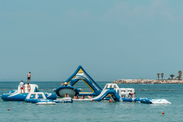 Όταν ανέβηκε η θερμοκρασία, θέλαμε και οι δύο μία ανάσα δροσιάς. Έτσι αφήσαμε τα πράγματα μας στις αναπαυτικές ξαπλώστρες του Balux, μπήκαμε στη θάλασσα και κολυμπήσαμε για να φτάσουμε στο απίστευτο water park. Κάνοντας κανονικά σαν μικρά παιδιά στο τραμπολίνο νερού και τα υπόλοιπα φουσκωτά παιχνίδια. Πάντα, βέβαια με σωσίβιο και πάντα με την επίβλεψη 2- 3 έμπειρων ναυαγοσωστών.