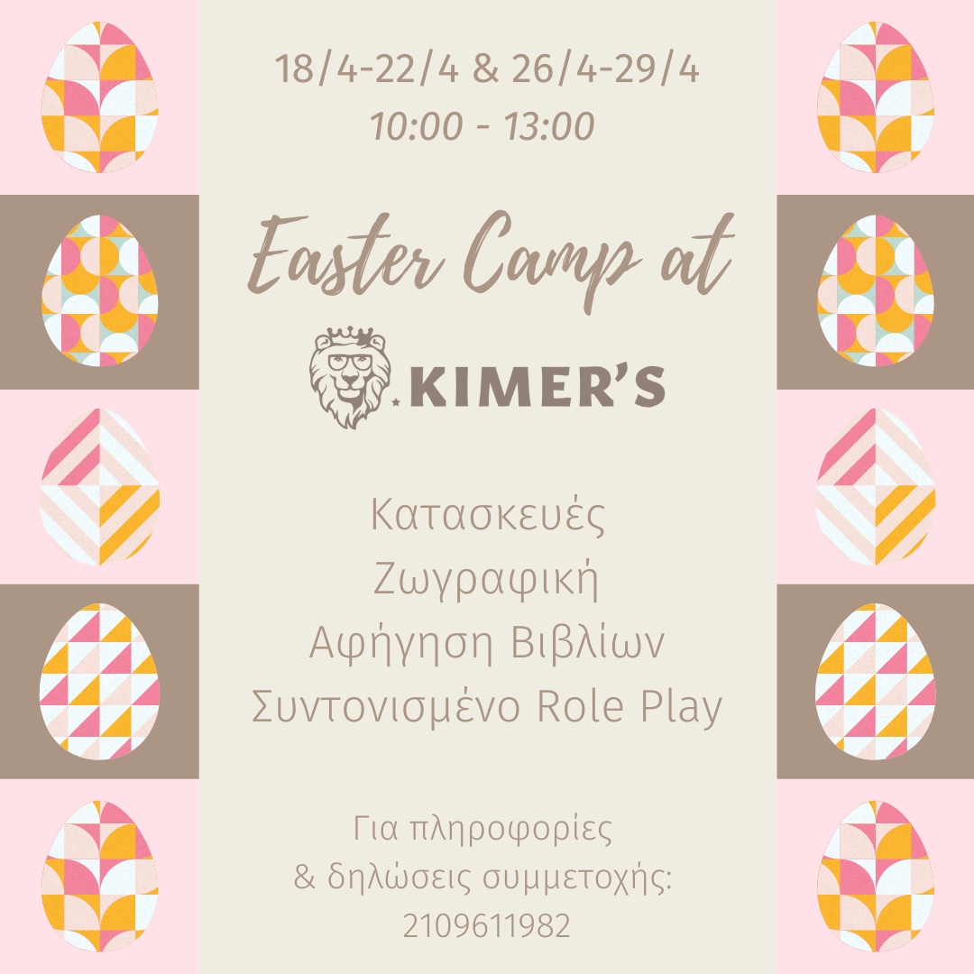 Ένα μοναδικό πασχαλινό camp με κατασκευές, ζωγραφική, αφήγηση παραμυθιών, συντονισμένο role play και πολλές ακόμη εκπλήξεις για όλα τα παιδιά στο Kimer's στη Γλυφάδα.