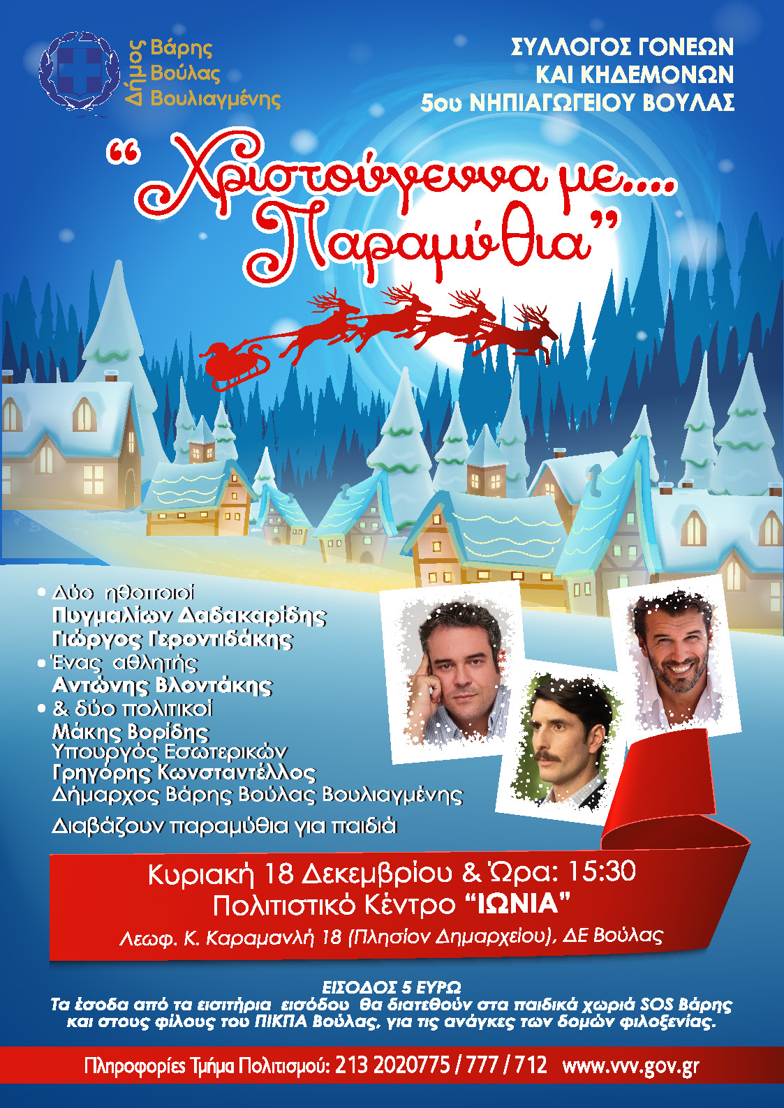 Ο Δήμαρχος, ένας Υπουργός, δύο Ηθοποιοί και ένας Αθλητής, θα διαβάσουν χριστουγεννιάτικα παραμύθια σε μια φιλανθρωπική εκδήλωση το Πολιτιστικό Κέντρο «Ιωνία» του Δήμου Βάρης Βούλας Βουλιαγμένης.
