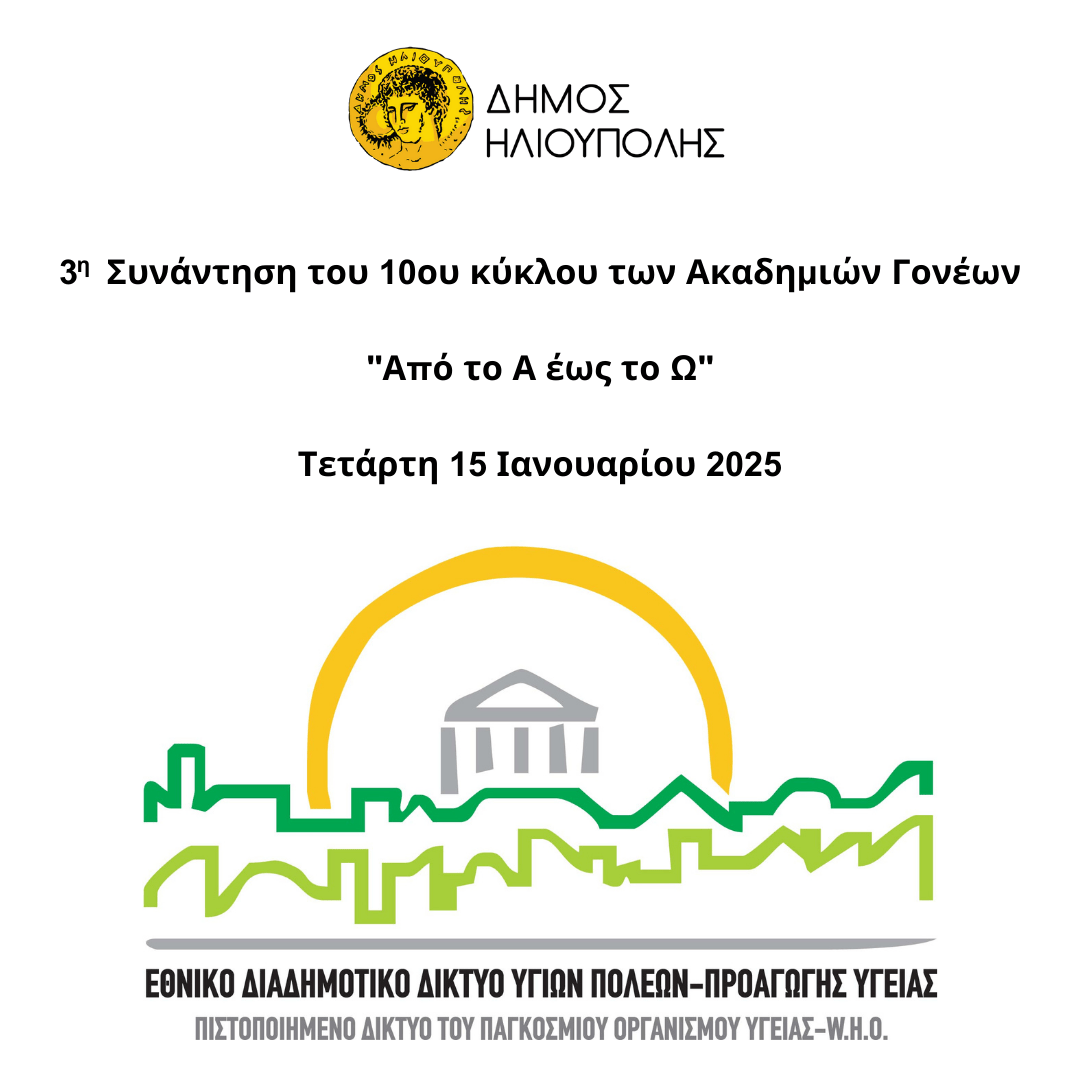 O Δήμος Ηλιούπολης και το Ελληνικό Διαδημοτικό Δίκτυο Υγιών Πόλεων (ΕΔΔΥΠΠΥ) του Π.Ο.Υ. σας καλούν να παρακολουθήσετε το πρόγραμμα της 3ης Συνάντησης της Ακαδημίας Γονέων που θα πραγματοποιηθεί την Τετάρτη 15 Ιανουαρίου 2025 και ώρα 18:15.