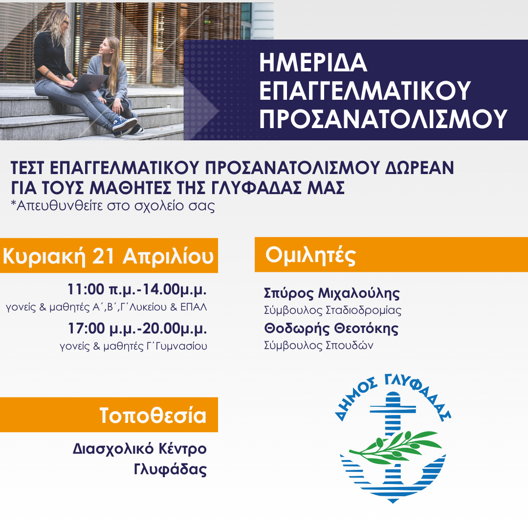Ο Δήμος Γλυφάδας διοργανώνει μία μεγάλη Ημερίδα Σχολικού Επαγγελματικού Προσανατολισμού την Κυριακή 21 Απριλίου, στο Διασχολικό Κέντρο Γλυφάδας.