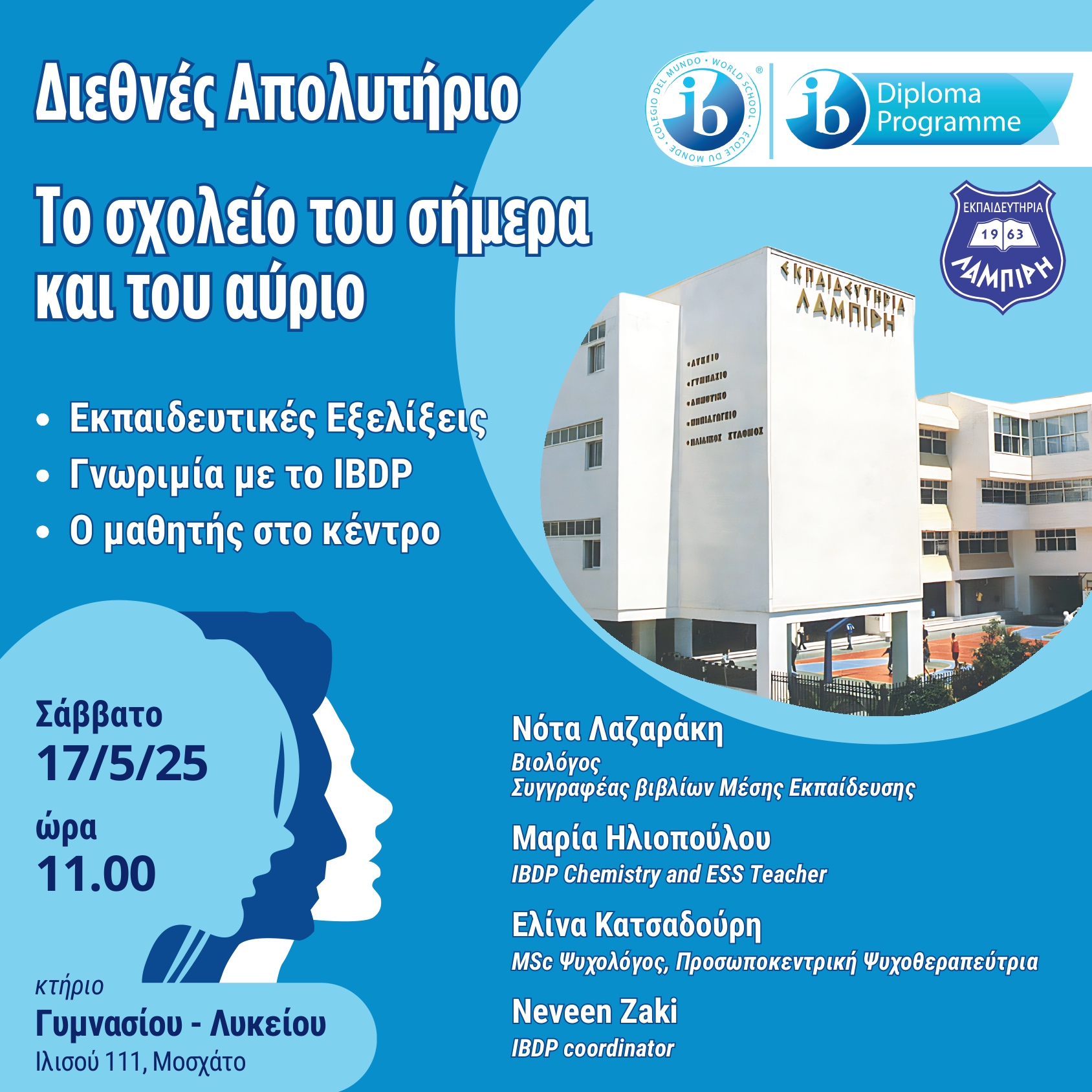 Το Σάββατο 17 Μαΐου στις 11 π.μ., τα Εκπαιδευτήρια Λαμπίρη στο Μοσχάτο διοργανώνουν ανοιχτή ημερίδα για το Διεθνές Απολυτήριο, με στόχο την ενημέρωση γονέων και ενδιαφερόμενων για τις εξελίξεις στην εκπαίδευση και τις προοπτικές εισαγωγής σε πανεπιστήμια του εξωτερικού.