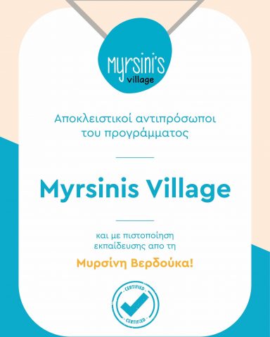 Το Myrsini’s village είναι ένα βιωματικό χωριό που δημιουργήσαμε σε μία αίθουσα της Σχολής μας. Ο χώρος διαμορφώθηκε σύμφωνα με τις προδιαγραφές του βραβευμένου project της Μυρσίνης Βερδούκα, η οποία δραστηριοποιείται με μεγάλη επιτυχία στον χώρο της ξενόγλωσσης εκπαίδευσης. Η Σχολή μας εξασφάλισε τα αποκλειστικά δικαιώματα του καινοτόμου αυτού προγράμματος στον Δήμο μας, στα 3Β.