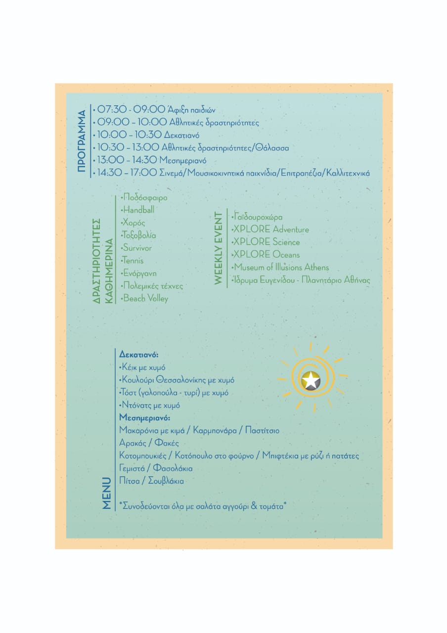 Ομαδικά αθλήματα, αθλητικά παιχνίδια και δημιουργικές δραστηριότητες όπως ποδόσφαιρο, τοξοβολία, πολεμικές τέχνες, beach volley, survivor games, επιτραπέζια, καθώς και μοναδικές εκπαιδευτικές εξορμήσεις, όπως επισκέψεις στο Museum of Illusions και στο Πλανητάριο, γεμίζουν την καθημερινότητα των παιδιών. Επιπλέον, καθημερινά περιλαμβάνονται δραστηριότητες στη θάλασσα και κολύμπι, προσφέροντας στα παιδιά την απόλυτη καλοκαιρινή εμπειρία. Όλες οι δραστηριότητες πραγματοποιούνται υπό την καθοδήγηση διπλωματούχων καθηγητών Φυσικής Αγωγής και έμπειρων παιδαγωγών, που στηρίζουν την ανάπτυξη των παιδιών τόσο σωματικά όσο και κοινωνικά.