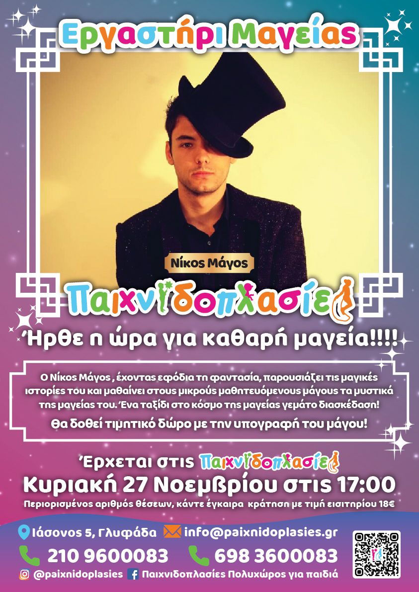 Ο Νίκος ο Μάγος έρχεται στον ψυχαγωγικό και εκπαιδευτικό πολυχώρο Παιχνιδοπλασίες της Γλυφάδας την Κυριακή 27 Νοεμβρίου και υπόσχεται να ταξιδέψει τα παιδιά στον κόσμο της μαγείας.