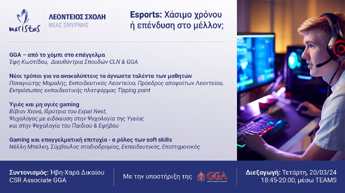 Η Λεόντειος Σχολή Νέας Σμύρνης σε συνεργασία με την Greek Gaming Academy, τον πρώτο και μοναδικό φορέα εκπαίδευσης Esports στην Ελλάδα, ο οποίος διαρκώς καινοτομεί με ενημερωτικές παρουσιάσεις και εκπαιδευτικά προγράμματα, συνδιοργανώνουν την εκδήλωση «Esports: Χάσιμο χρόνου ή επένδυση στο μέλλον;».