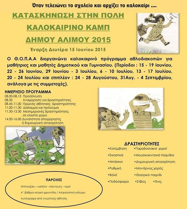 Οι εγγραφές έχουν ξεκινήσει για την πρώτη περίοδο του καλοκαιρινού καμπ που διοργανώνει ο Δήμος Αλίμου, ένα καλοκαιρινό πρόγραμμα αθλοπαιδιών για μαθητές και μαθήτριες Δημοτικού και Γυμνασίου, που ξεκινά τη Δευτέρα 15 Ιουνίου.
