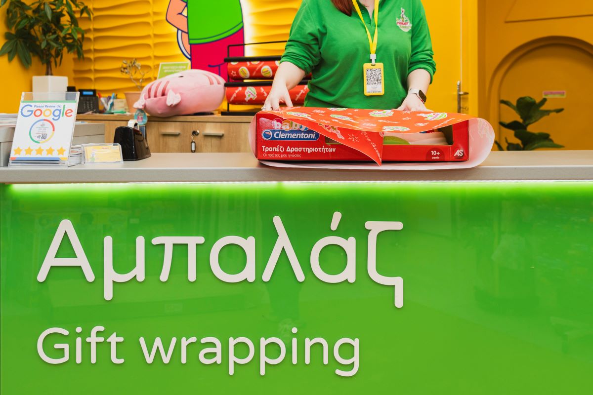 Και όλα αυτά μπορούν να μεταμορφωθούν στο πιο όμορφο χριστουγεννιάτικο δώρο στο τμήμα αμπαλάζ του καταστήματος που θα βρεις στην υποδοχή, που δίνει σημασία στην κάθε λεπτομέρεια.