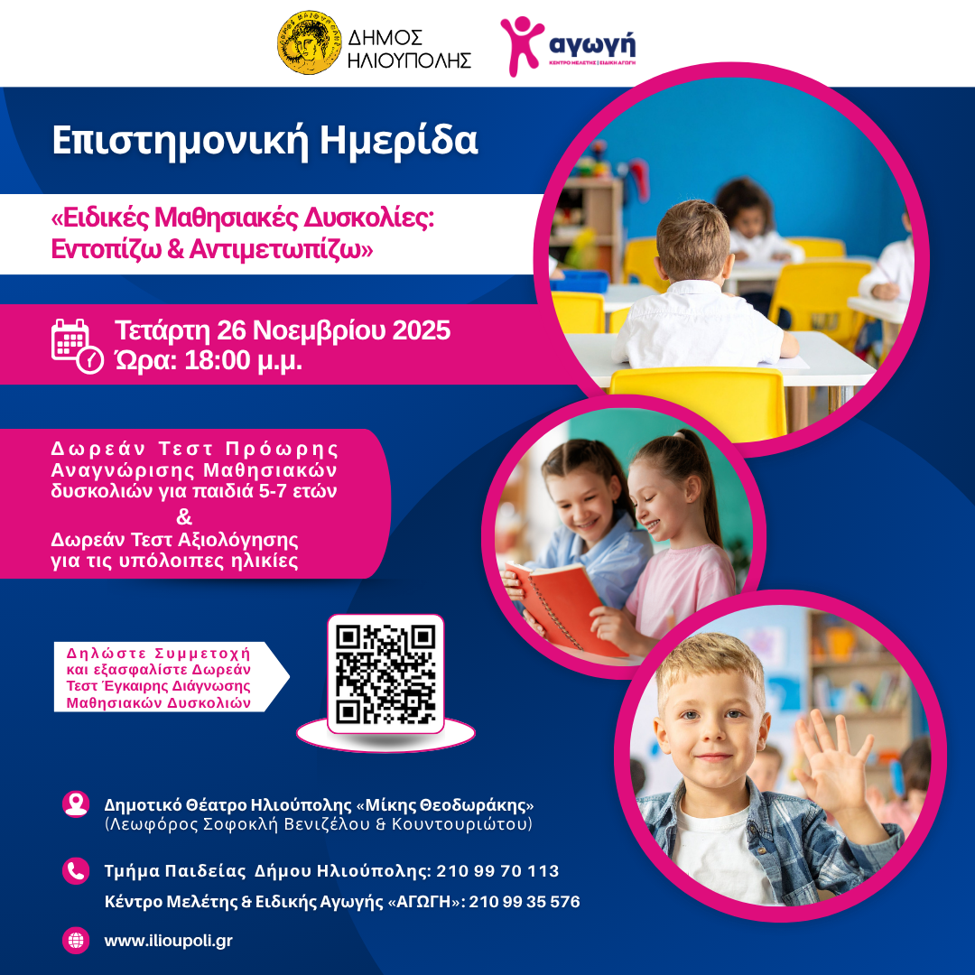 Ο Δήμος Ηλιούπολης και η Αλυσίδα ΑΓΩΓΗ συνδιοργανώνουν επιστημονική ημερίδα με τίτλο «Ειδικές Μαθησιακές Δυσκολίες: Εντοπίζω & Αντιμετωπίζω» την Τετάρτη 26 Νοεμβρίου 2025 στις 18:00 μ.μ. στο Δημοτικό Θέατρο Ηλιούπολης «Μίκης Θεοδωράκης».