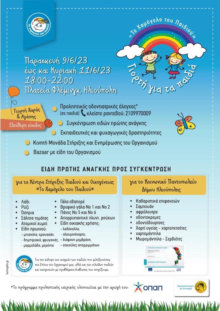 «Το Χαμόγελο του Παιδιού» μας προσκαλεί στην καλοκαιρινή γιορτή για τα παιδιά που θα πραγματοποιηθεί από την Παρασκευή 9 Ιουνίου 2023 έως και την Κυριακή 11 Ιουνίου 2023 (ώρες 18:00 έως τις 22:00) στην Πλατεία Φλέμινγκ με την υποστήριξη του Δήμου Ηλιούπολης και με δωρεάν είσοδο.