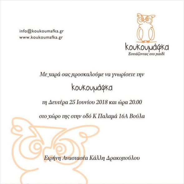 Στην οδό Κωστή Παλαμά 16Α στη Βούλα, δημιουργείται ένας άκρως ευφάνταστος και ιδιαίτερος χώρος δημιουργικής απασχόλησης για παιδιά που αξίζει να γνωρίσετε. Στα εγκαίνια του, λοιπόν, θα έχετε την ευκαιρία να δείτε από κοντά τους υπεύθυνους και να ενημερωθείτε για τις ποικίλες παροχές. Κουκουμάφκα = κουκουβάγια, μία ονομασία καθόλου τυχαία.