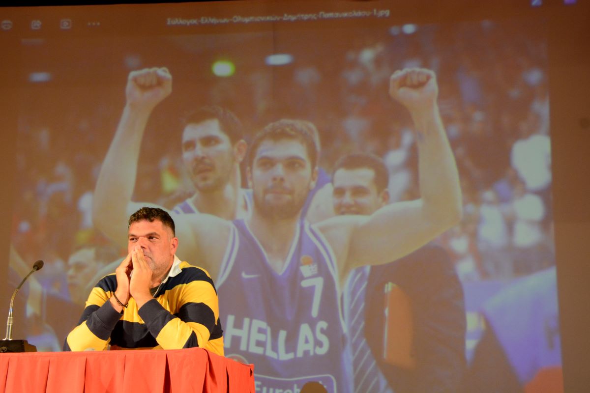 Ας μην ξεχνάμε όμως και τον αθλητισμό, που ήταν τεράστιο κομμάτι της ζωής του. Είναι ο μοναδικός Έλληνας μπασκετμπολίστας που έχει κερδίσει δύο φορές το triple crown (Ευρωλίγκα, πρωτάθλημα και κύπελλο) και έχει στο ενεργητικό του αμέτρητες διακρίσεις. «Σας απαρίθμησα τις χρονιές που πέτυχα, αλλά μέσα στα 20 χρόνια υπήρχαν και ήττες. Η διαφορά μεταξύ του νικητή και του ηττημένου είναι ότι ο πρώτος προσπάθησε μία ακόμη φορά». Η συμβουλή που έδωσε στα παιδιά είναι να ακολουθούν τη φλόγα που έχουν μέσα τους, αλλά να μην βασιστούν μόνο στον αθλητισμό. «Πιο εύκολα θα ισορροπείτε πάνω σε ένα βιβλίο, παρά σε μία μπάλα». Αναφέρθηκε στα δύσκολα παιδικά του χρόνια και στο ότι κανείς δεν πρέπει να κρίνεται από τα ρούχα που φορά ή την οικονομική του άνεση, αλλά από τη συμπεριφορά του απέναντι στους άλλους.